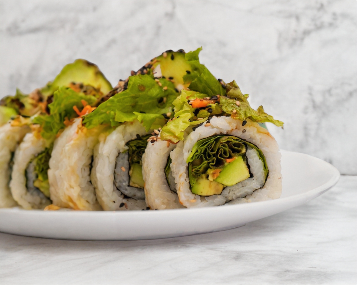 10 piezas de rollo estilo california (alga por dentro) relleno de ensalada verde, aguacate y pepino
