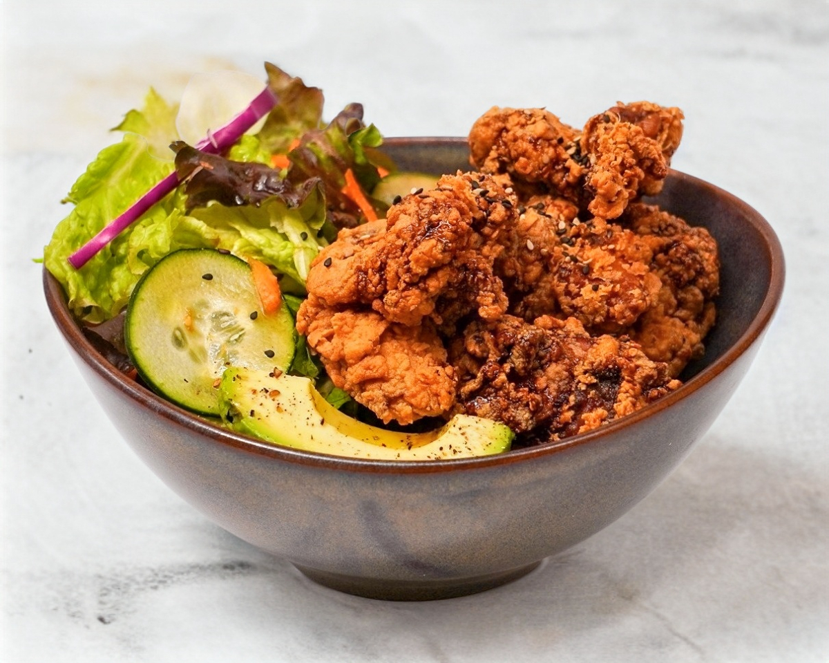 Bowl de arroz acompañado con pollo frito karaage, ensalada verde y aguacate