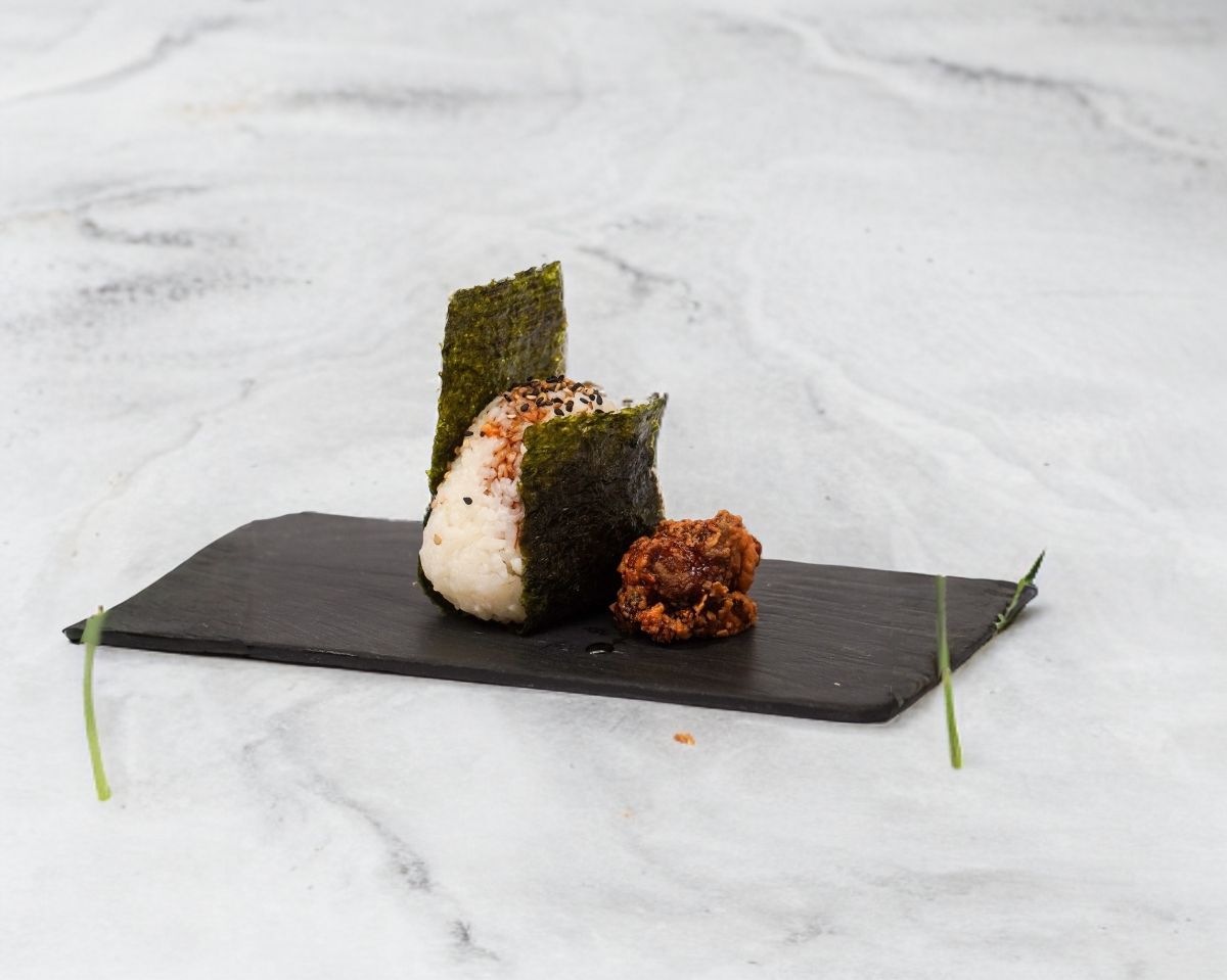 Bola de arroz tradicional japonesa en forma triangular rodeada por alga nori con 1 pieza de pollo frito (karaage) con salsa chipotle mayo
