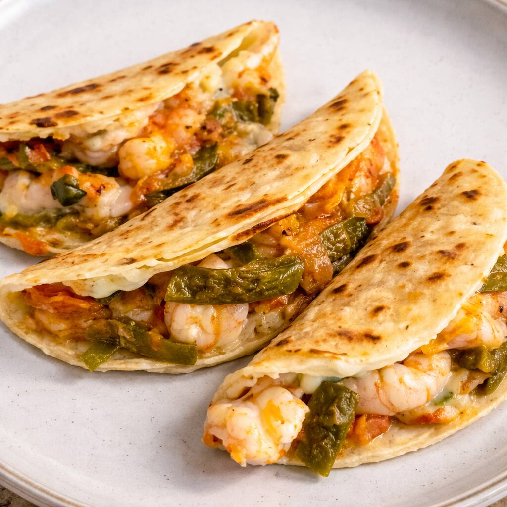 Tres deliciosos tacos estilo gobernador preparados con tortilla doradita, rellenos de camarón salteado, queso derretido y chile poblano, creando una combinación cremosa y llena de sabor. Perfectos para disfrutar en cuaresma