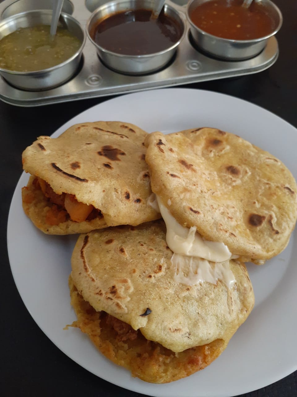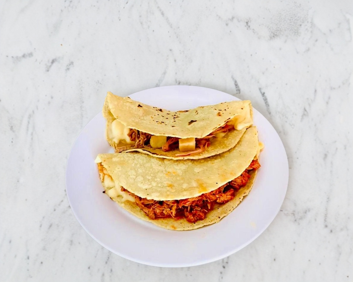 Tortilla de maíz hecha a mano, queso asadero, guisado a elección de (40-45 g), complementos y salsas.