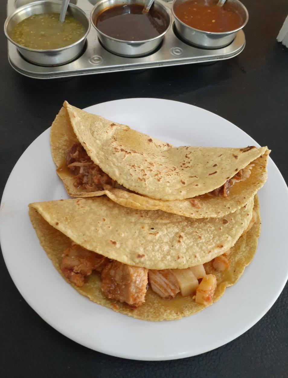 Tortilla de maíz hecha a mano, queso asadero, un guisado a elección de 40-45 g y complementos por aparte: salsas (disponible en el momento).