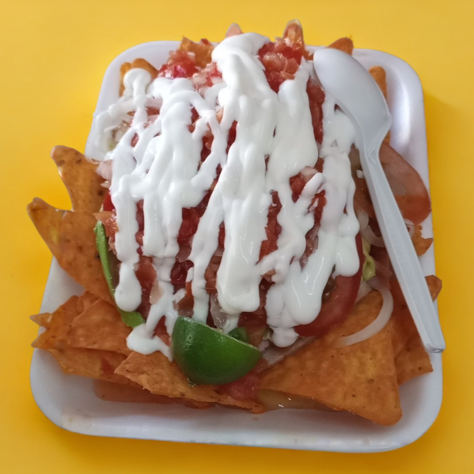 Doritos, cueritos, carne molida, lomo, jamón, aguacate, jitomate, cebolla, salsa, crema y limón.