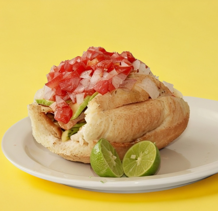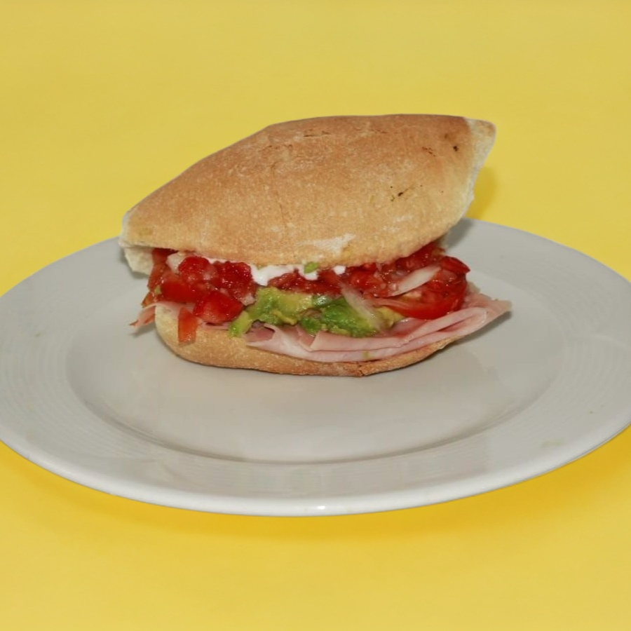 Bolillo, jamón, crema, aguacate, jitomate, cebolla.
