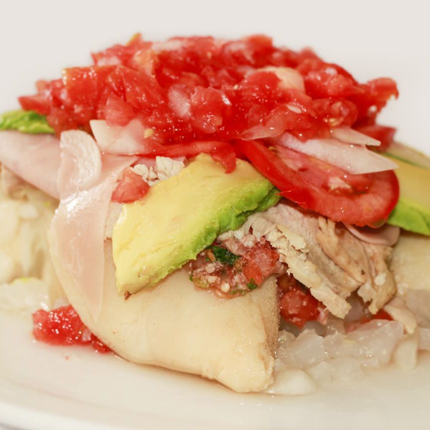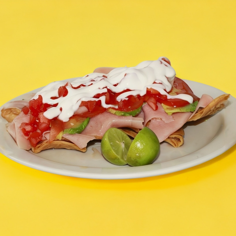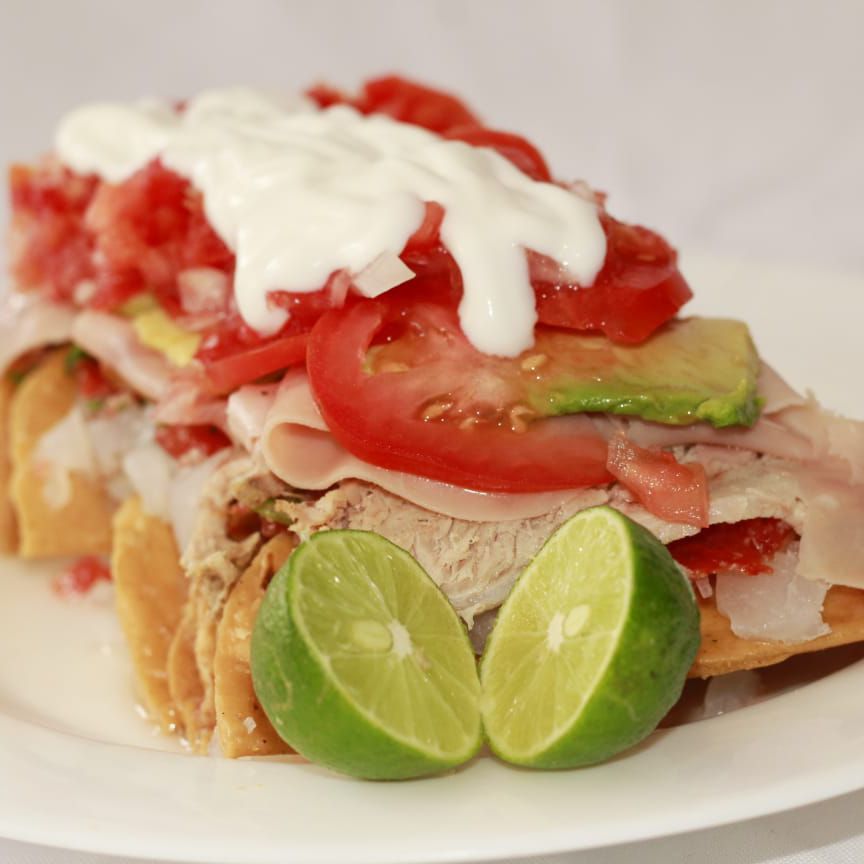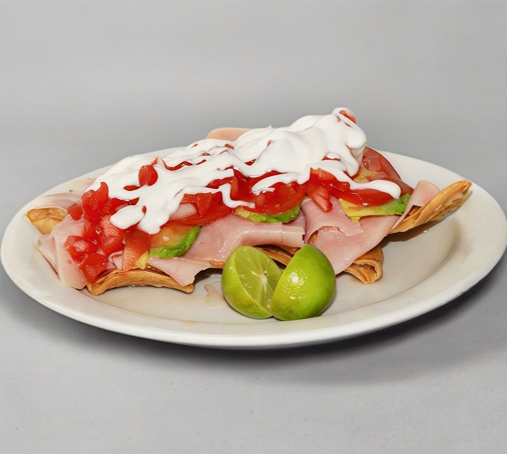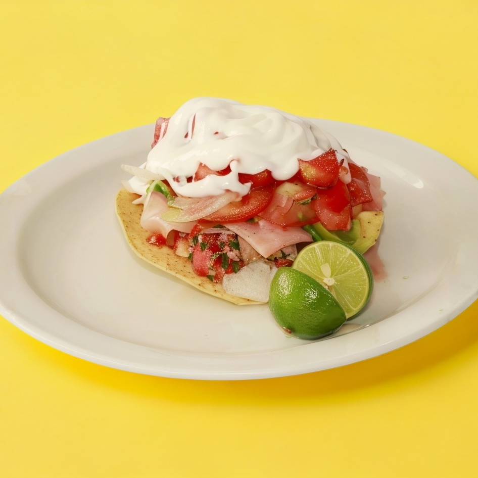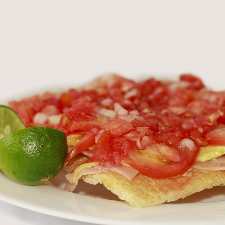 Tostada, jamón, aguacate, jitomate, cebolla, salsa, crema y limón.