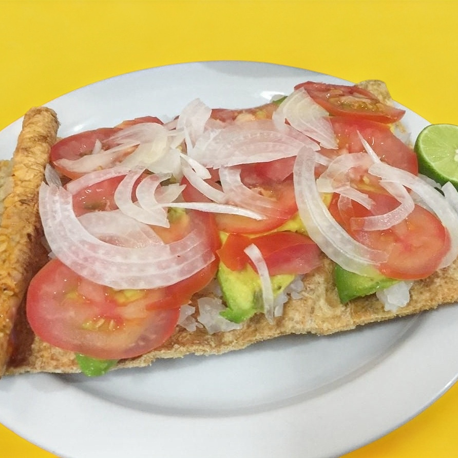 Tostada, cueritos, aguacate, jitomate, cebolla y limón.