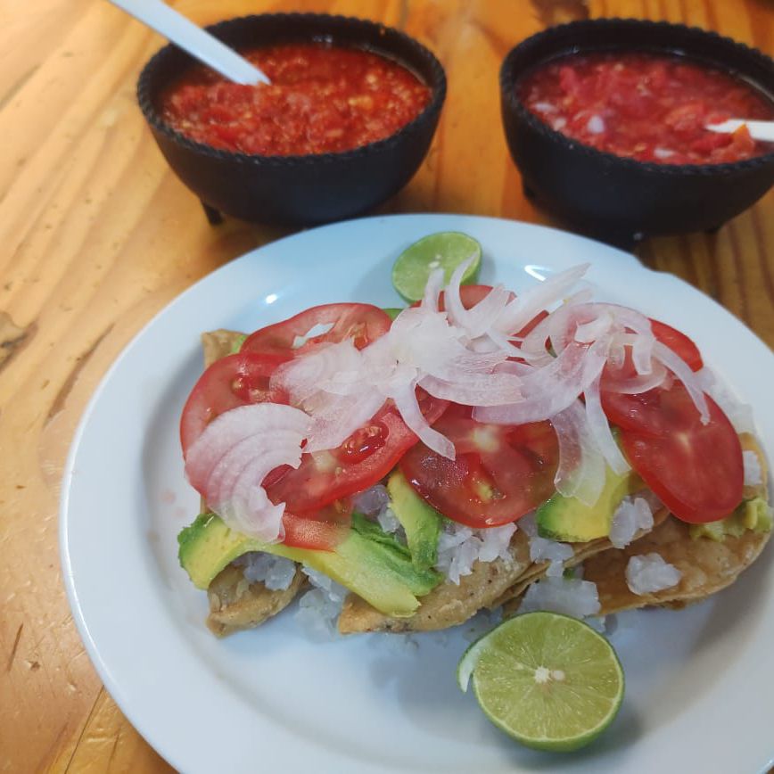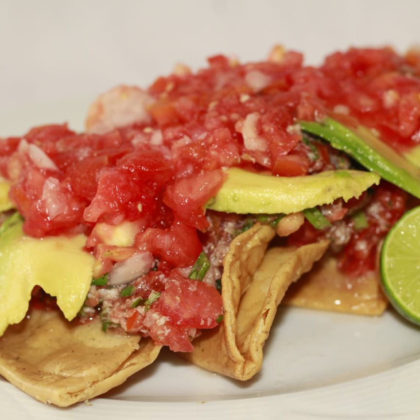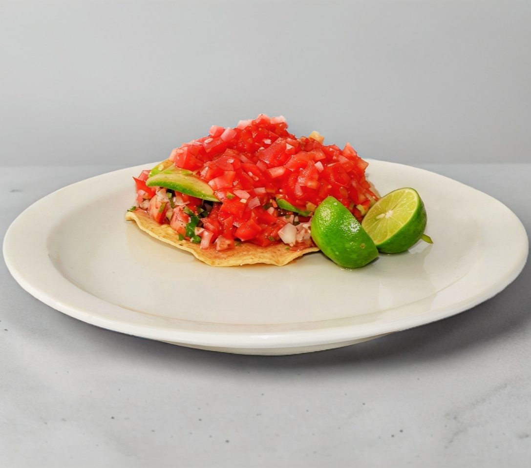 Tostada, carne molida, aguacate, salsa y limón.