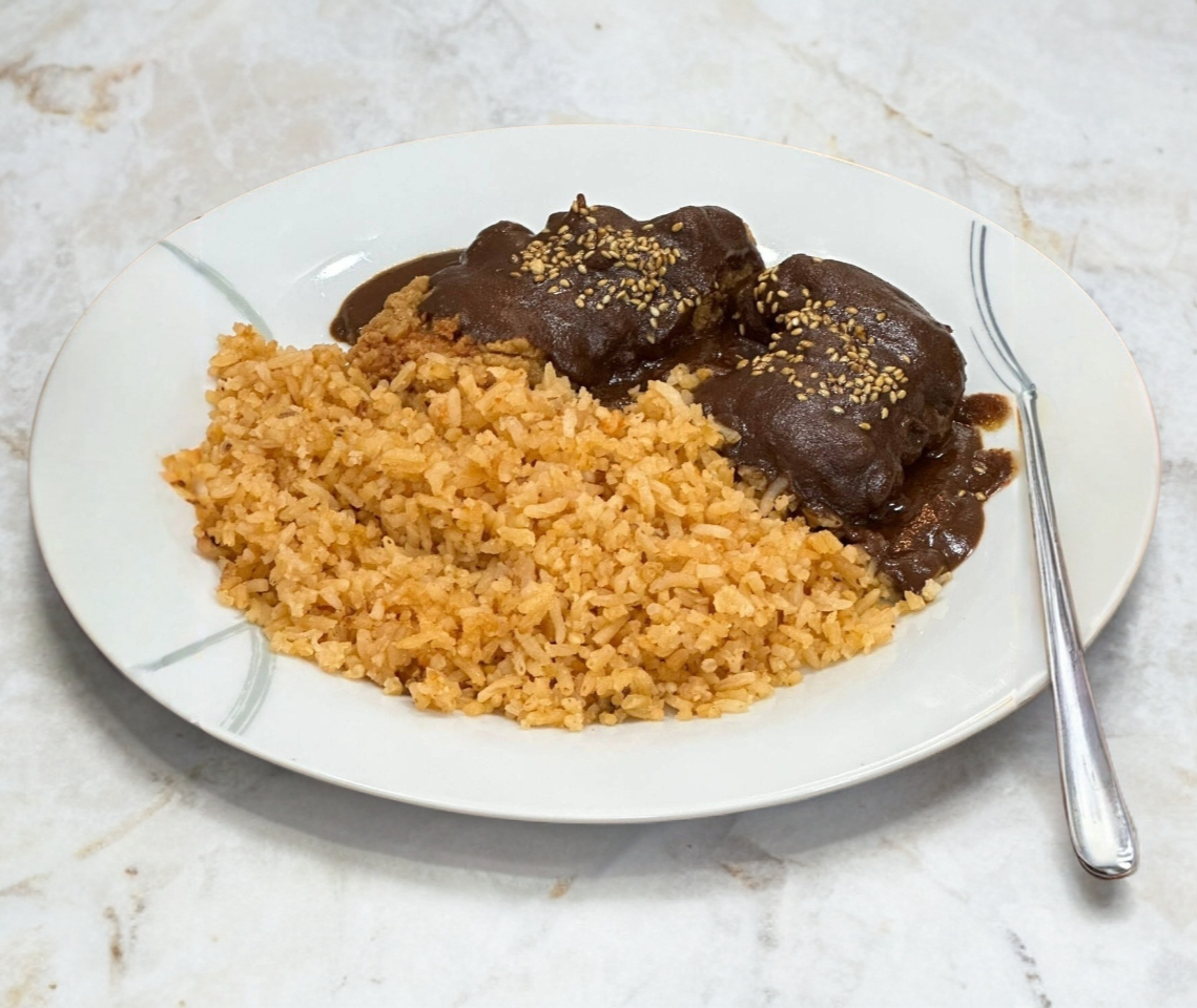 2 muslos de pollo bañados con mole poblano y acompañados de arroz rojo, tortillas y chiles en vinagre. Contiene semillas de sesamo.