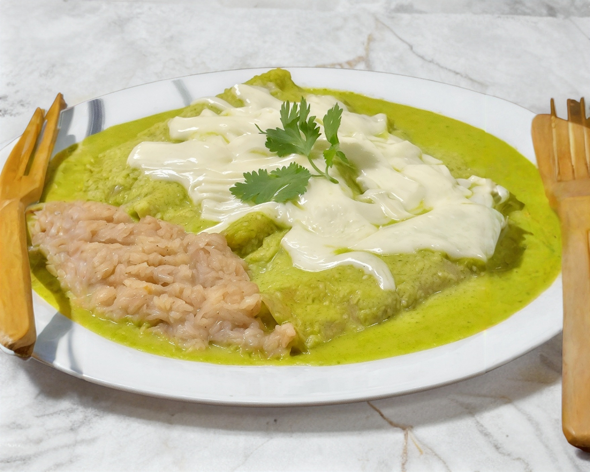 Enchiladas rellenas de pollo bañadas con salsa de crema de chile poblano y queso fundido acompañadas con frijoles refritos.