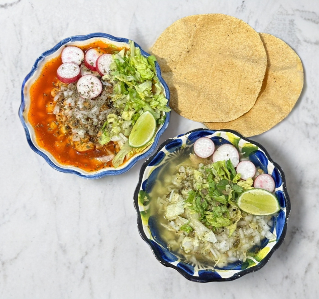 Pozole con carne de cerdo, acompañado de lechuga, cebolla, rábanos, chile seco y tostadas