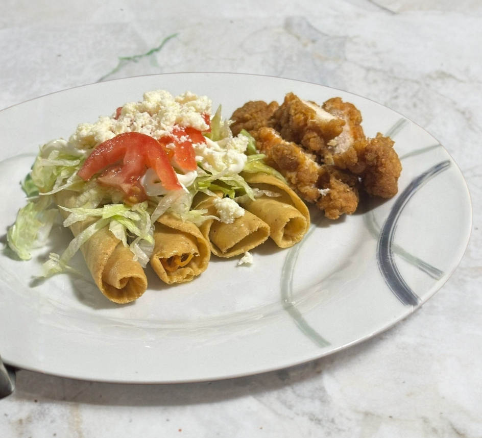 4 flautas rellenas de pollo o papa guisada acompañadas de pechuga de pollo empanizada con lechuga, jitomate, queso fresco y crema. Salsa aparte.