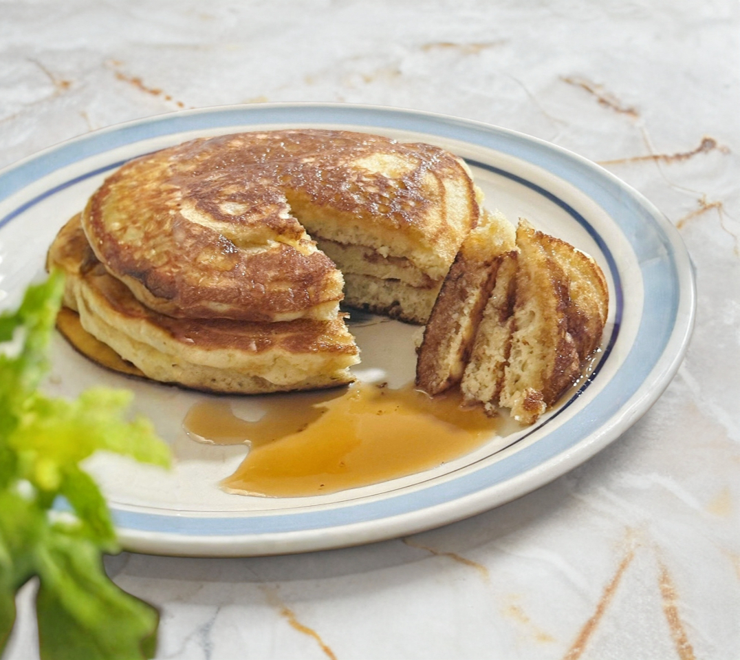 3 piezas de pancakes de mantequilla acompañados de Miel Maple y Mermelada de Fresa