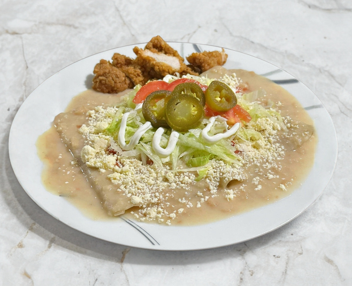 4 enfrijoladas rellenas de queso cotija autentico de Michoacan y encurtido de jitomate y cebolla, acompañadas de pechuga de pollo empanizada, lechuga, queso cotija, crema, jitomate y chiles en vinagre.