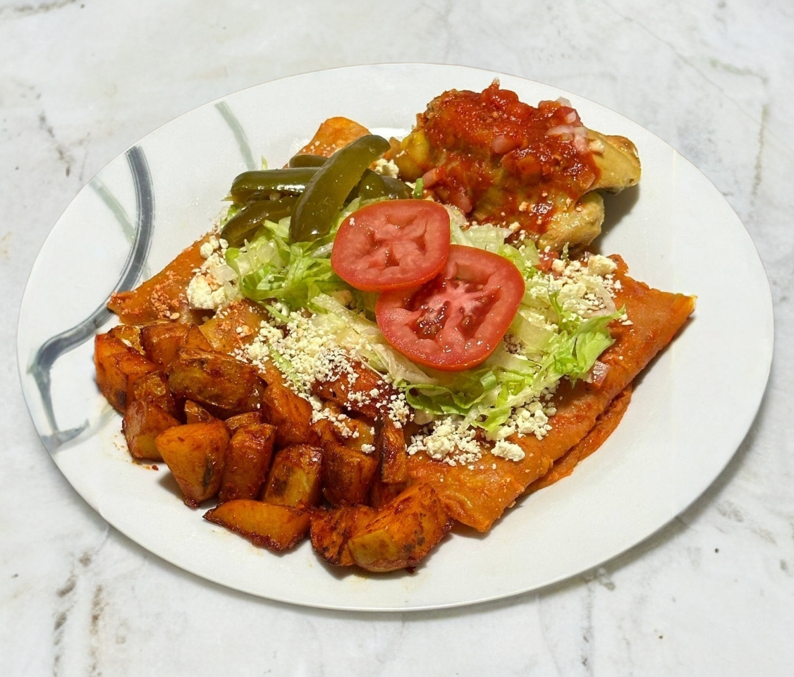 Enchiladas bañadas en salsa de guajillo rellenas de queso cotija autentico de Michoacan y encurtido de jitomate y cebolla, acompañadas de un muslo de pollo dorado y papas adobadas, lechuga, jitomate y chile en vinagre.
