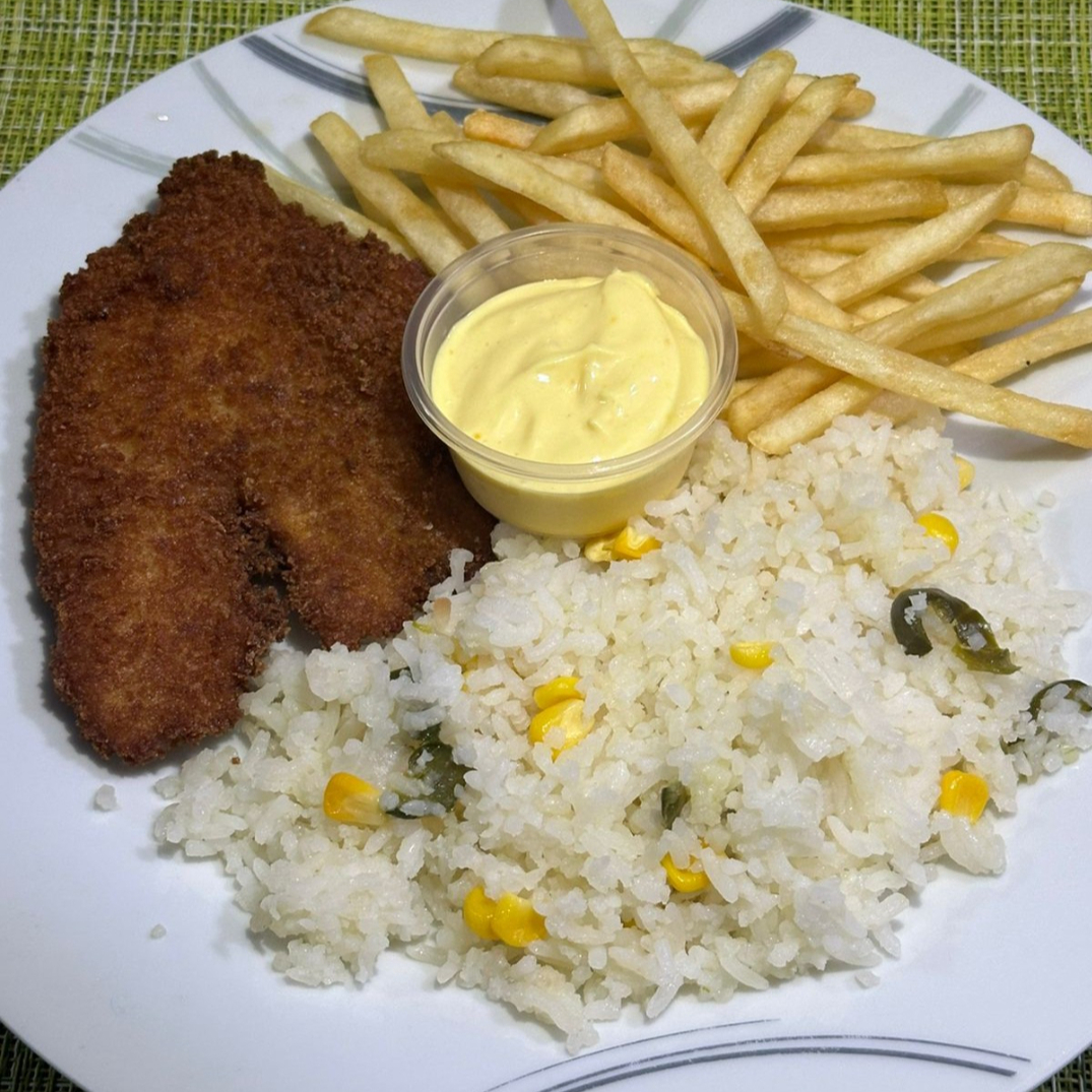 Filete de tilapia empanizado acompañado de arroz poblano, papas a la francesa, aderezo de habanero limon y tortillas.