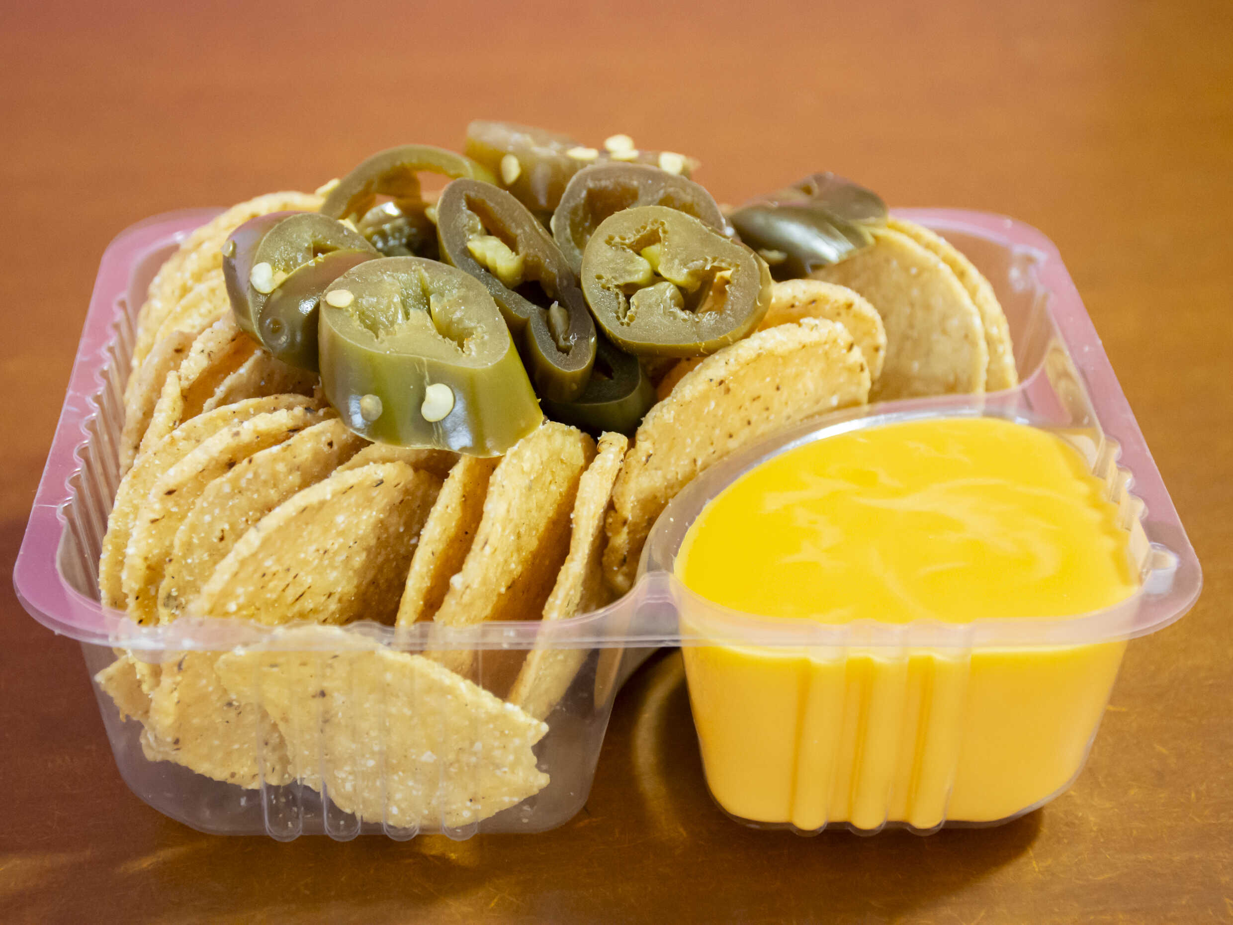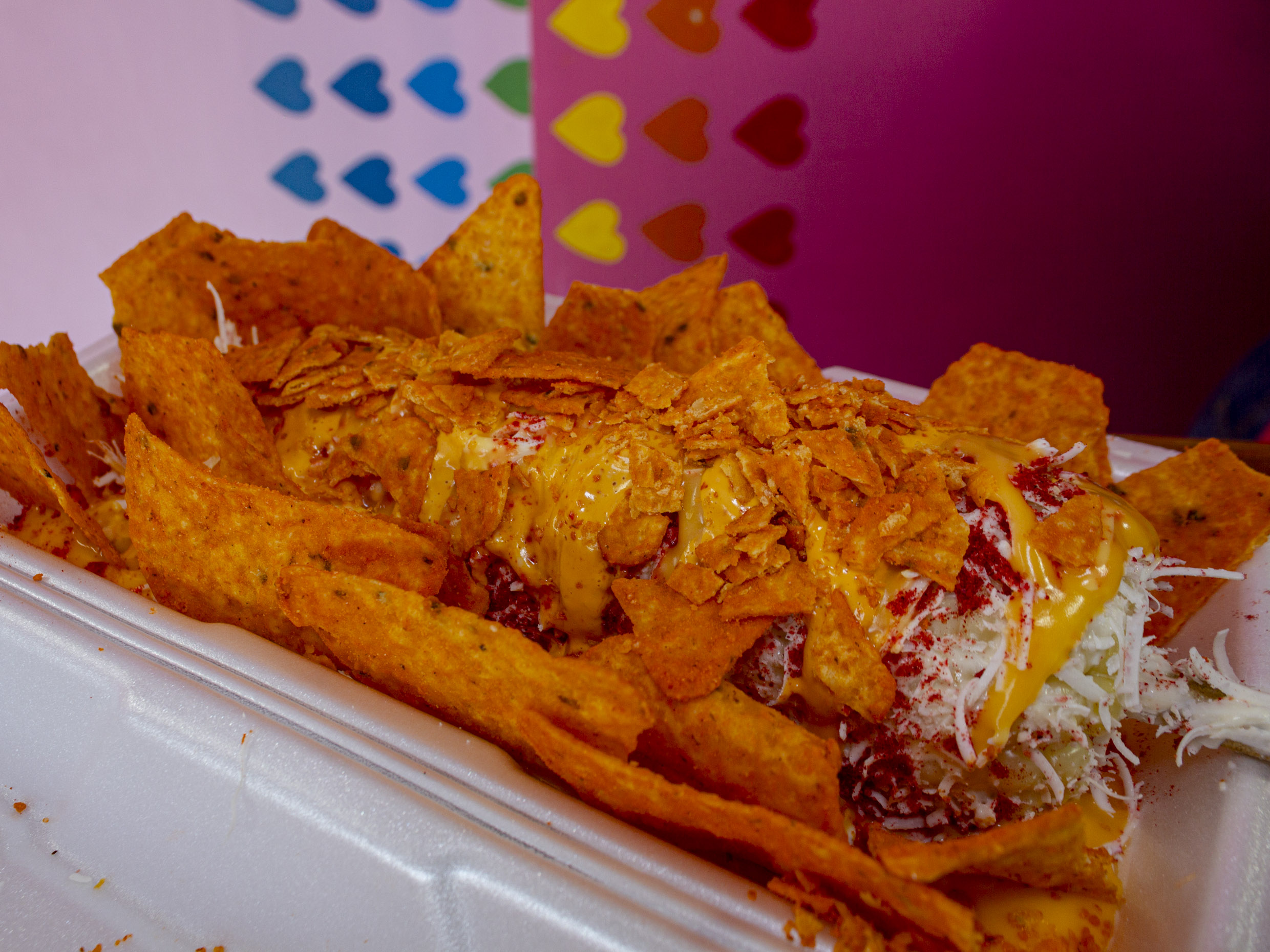 Doritos acompañados de elote, crema, mayonesa, limón, mantequilla, chile, sal, queso rallado, chimichurri y queso amarillo.