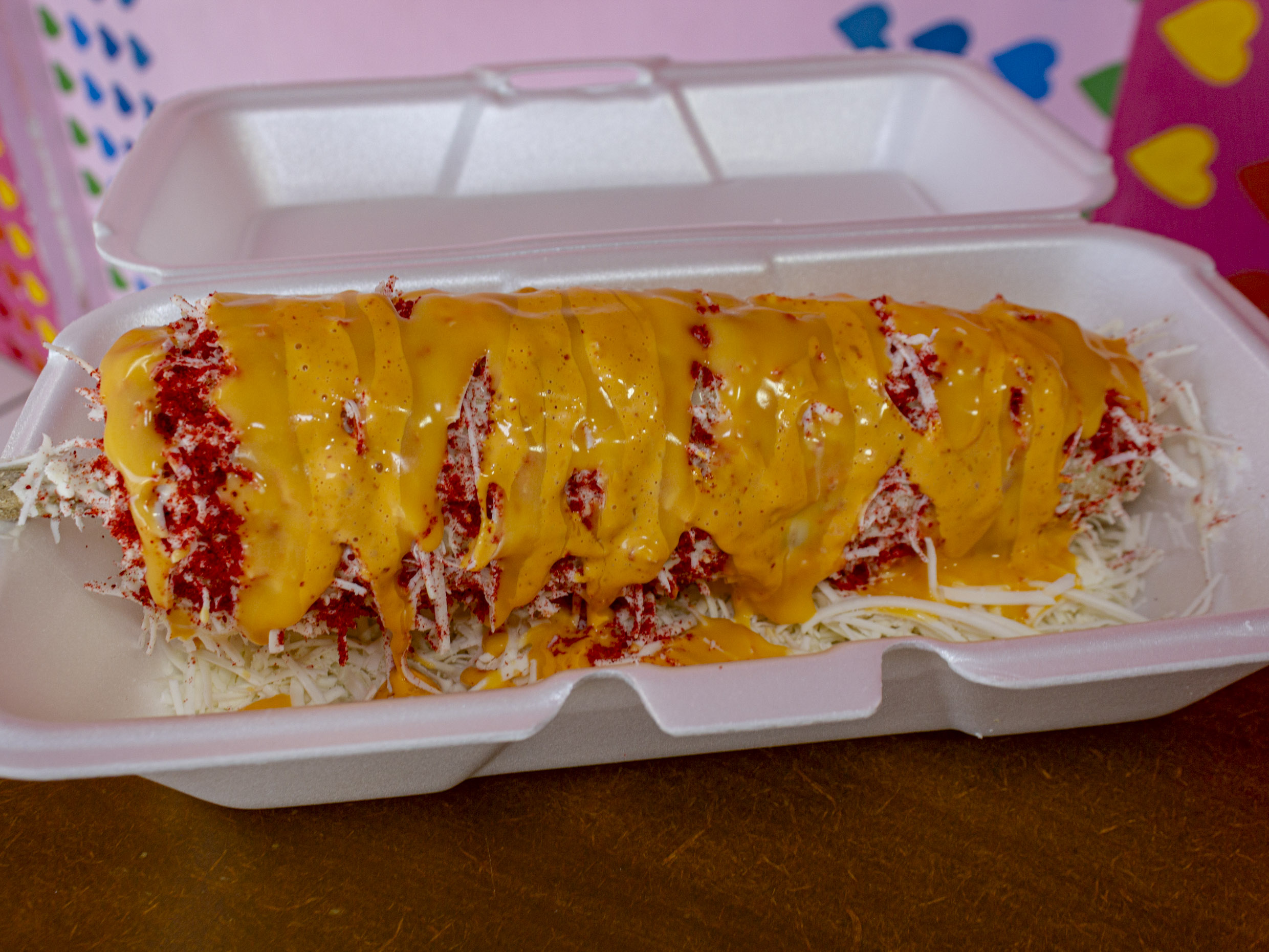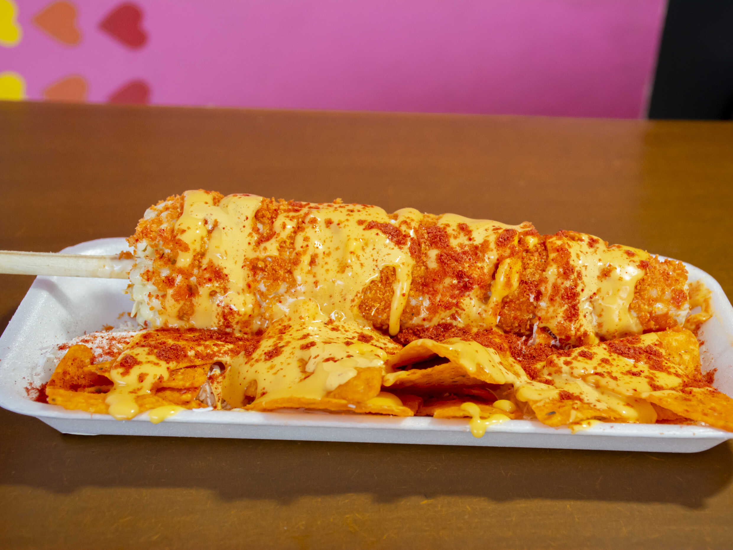 Delicioso elote empanizado con tus papas preferidas, preparado con crema, mayonesa, limón, mantequilla, chile, sal, queso rallado, chimichurri y queso amarillo.