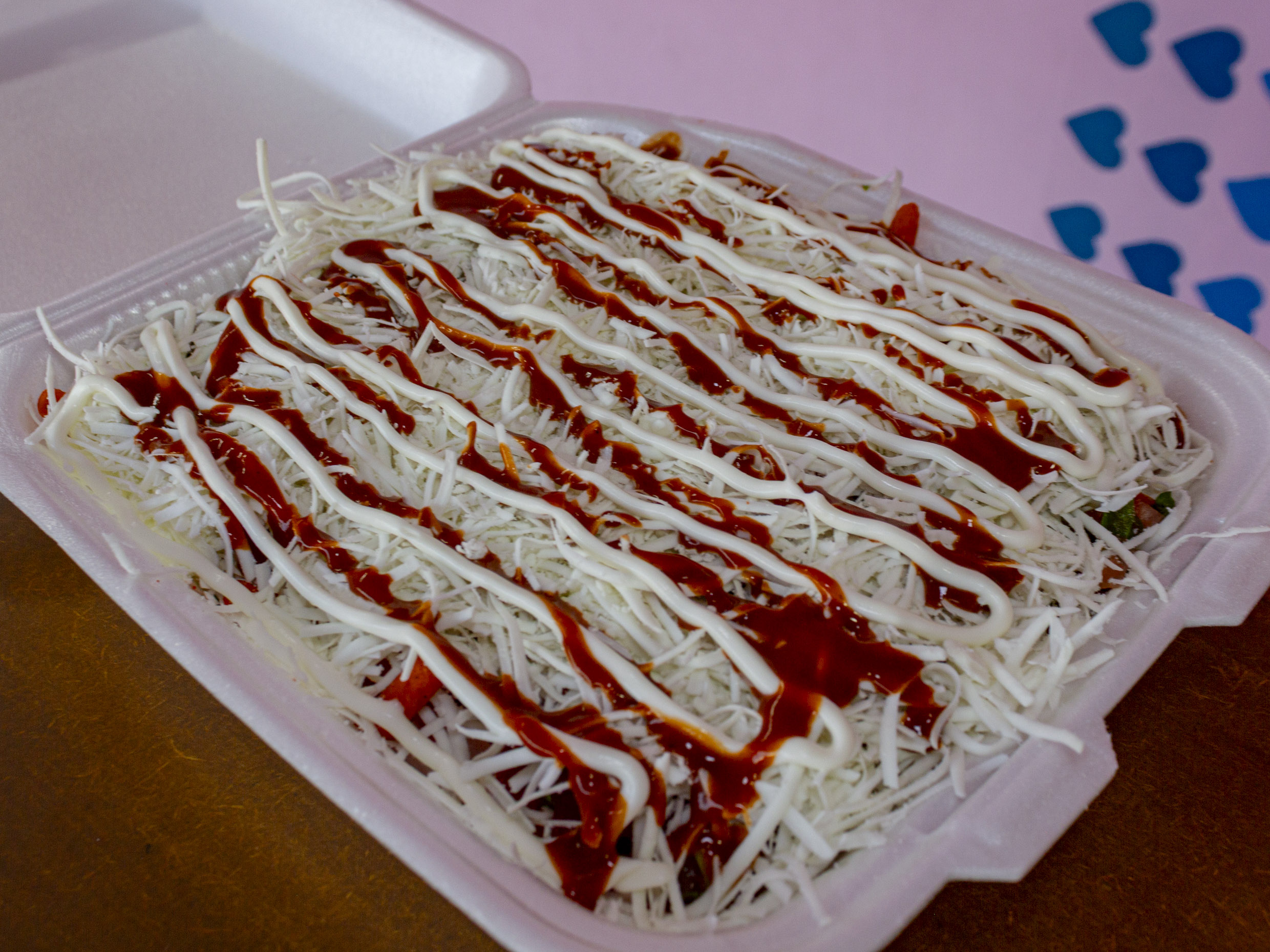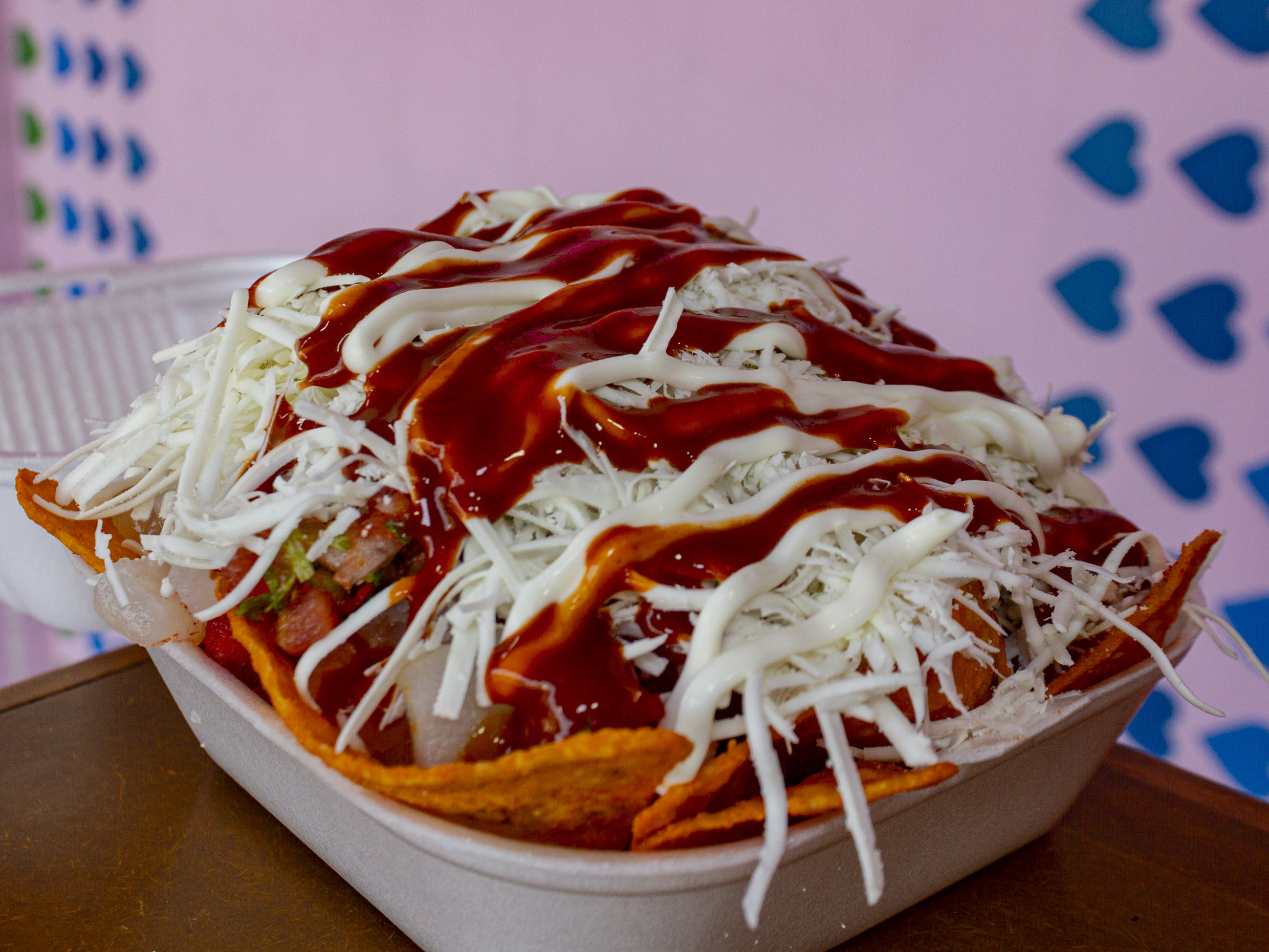 Doritos preparados con churro rojo, cacahuate, maruchan, cueritos, salsa de jitomate, queso rallado, crema y salsa de botella