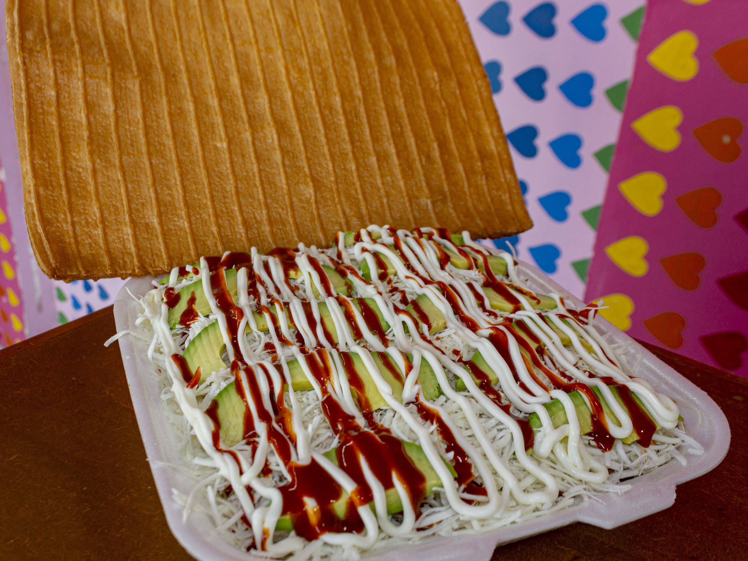 Duró preparado con repollo, salsa de jitomate, cueritos, churro rojo, cacahuate, queso rallado, aguacate, crema y salsa de botella