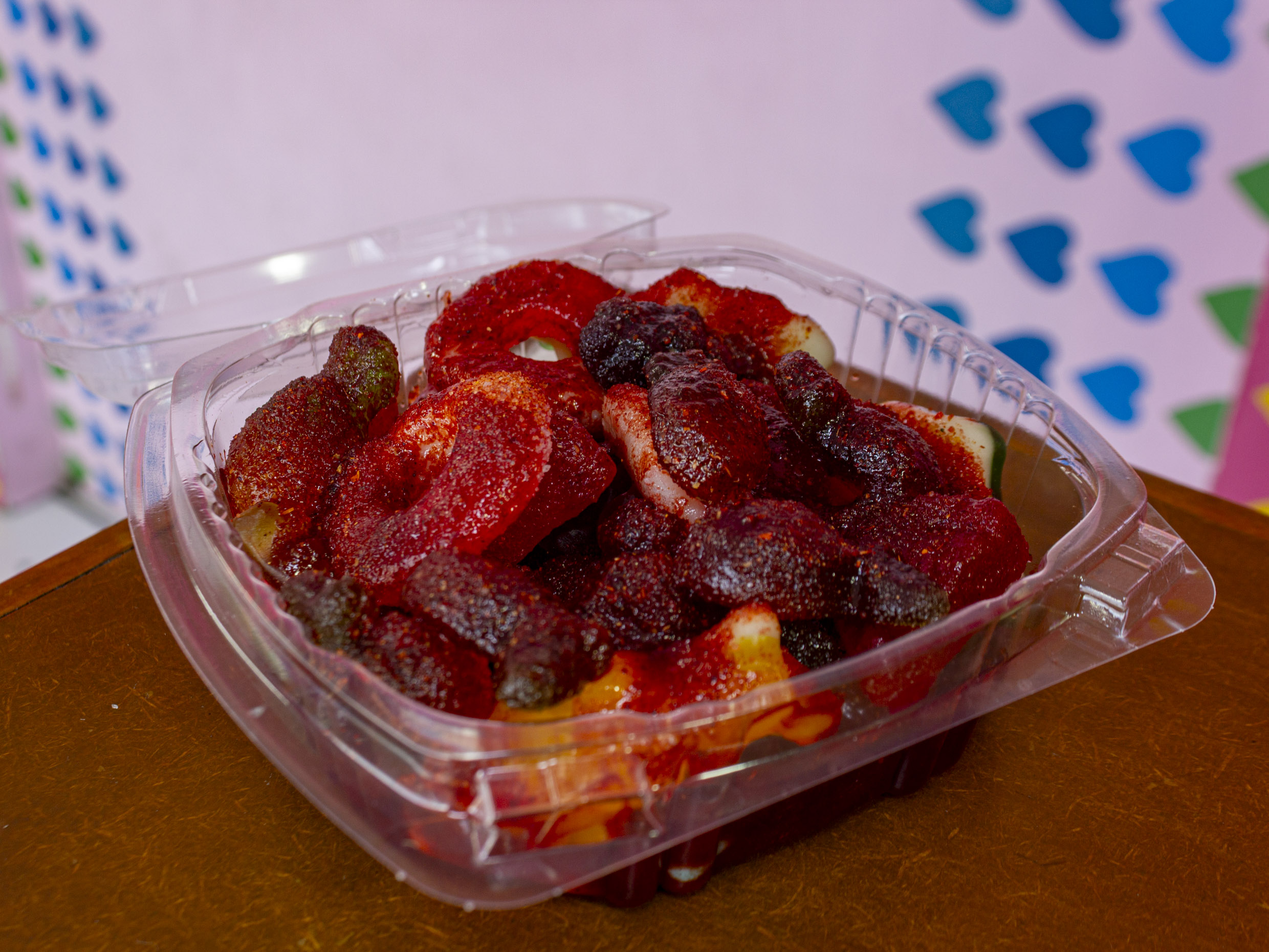 Variedad de gomitas con chamuyo líquido y chamoy en polvo