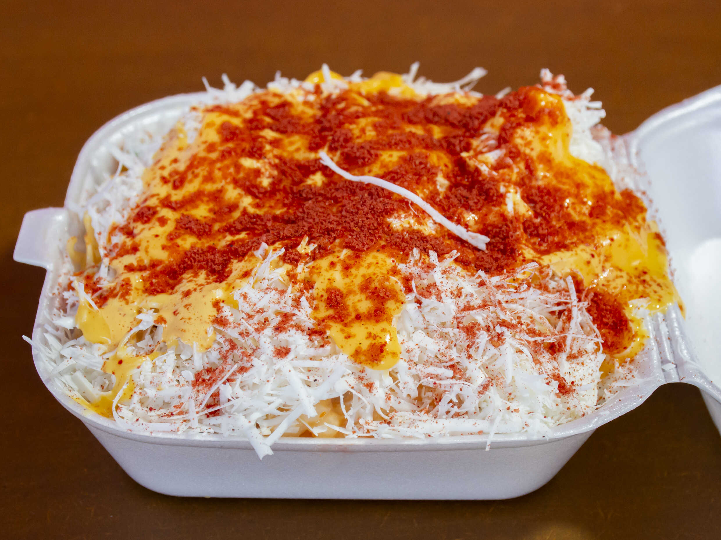 Charola con elote desgranado preparado con mantequilla, limón, crema, mayonesa, chile de polvo, chimichurri una capa de queso rallado, queso amarillo y elote en palo