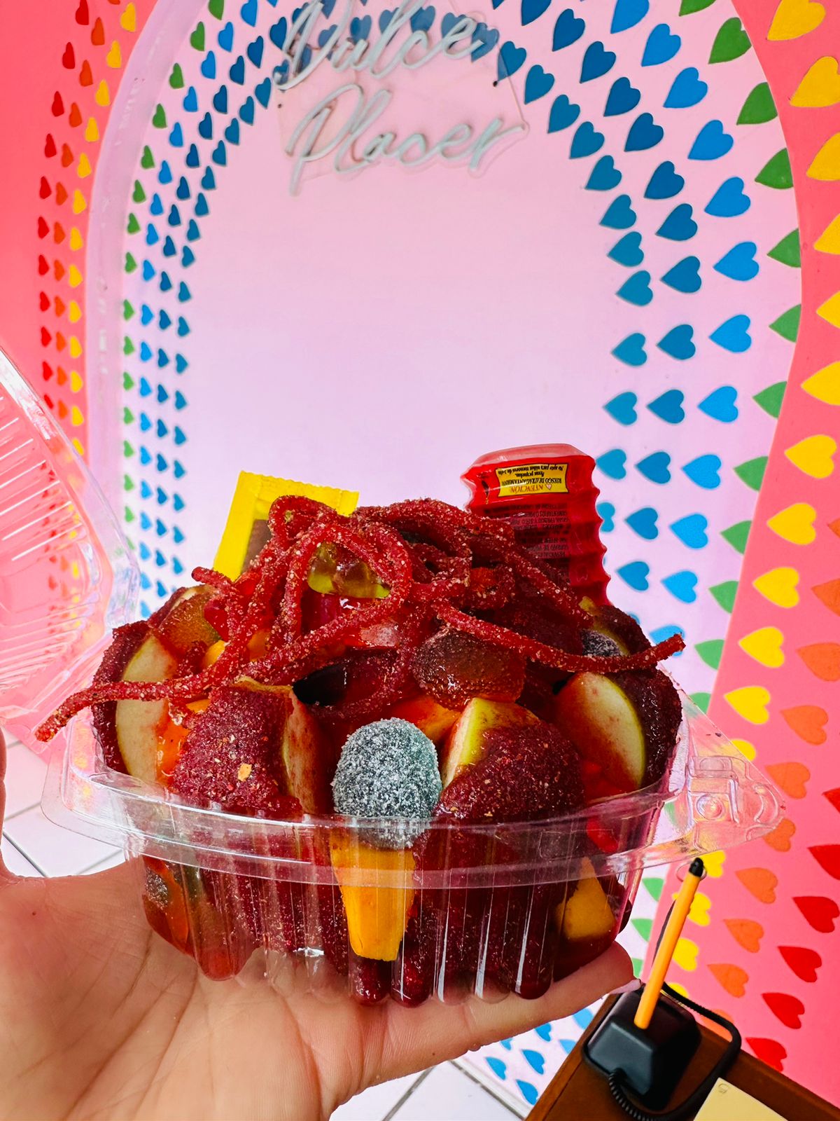 Manzana empanizada de pasta de chamoy y preparada con variedad de gomitas ,skuincles y lukas.