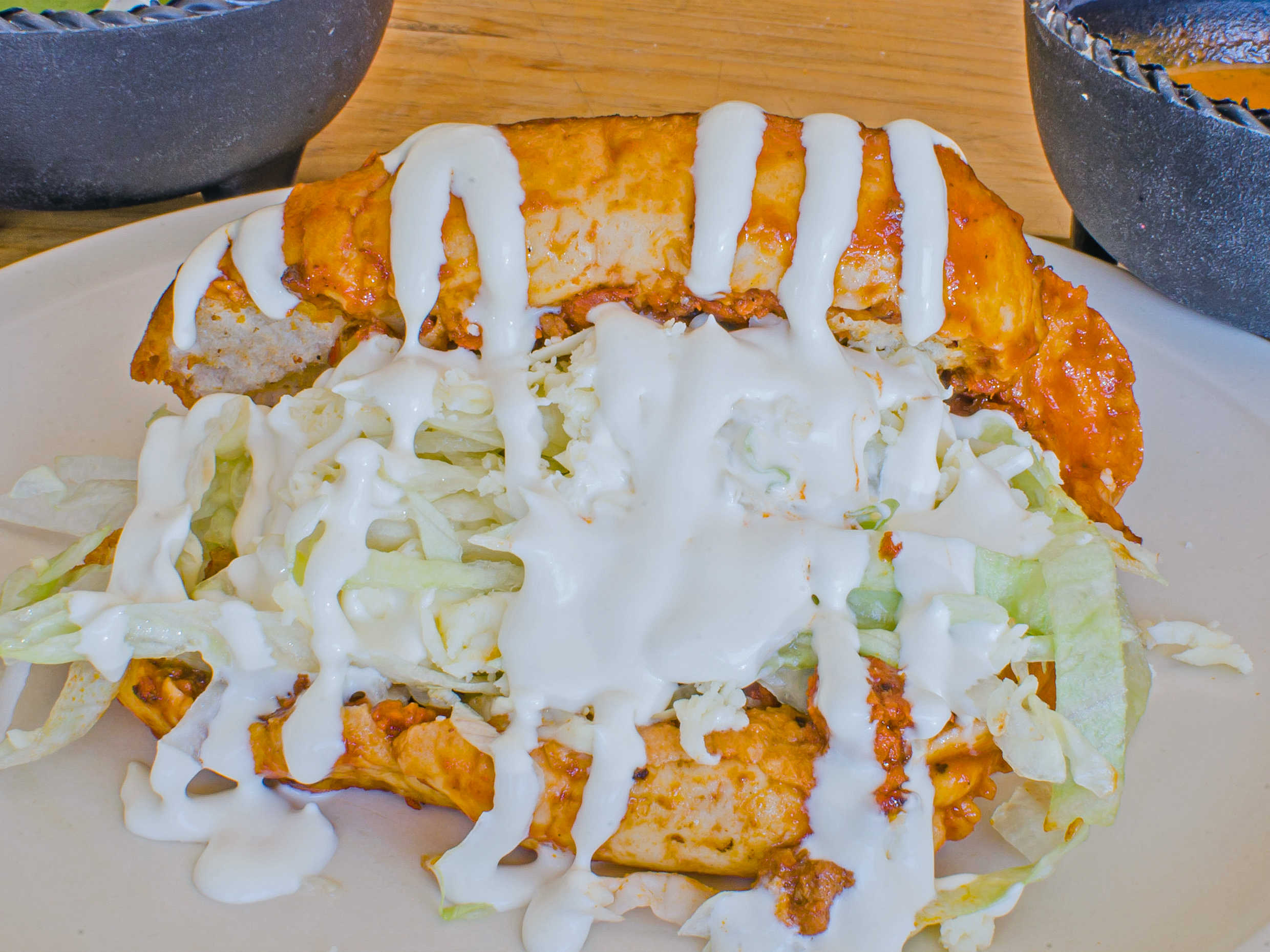 Bolillo bañado de salsa no picante , adentro lleva chorizo con papas, preparado con lechuga queso y crema