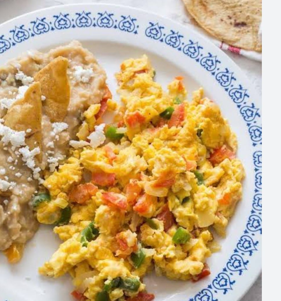 Huevo revuelto con cebolla,chile y jitomate Acompañado de frijol,bolillo o tortilla