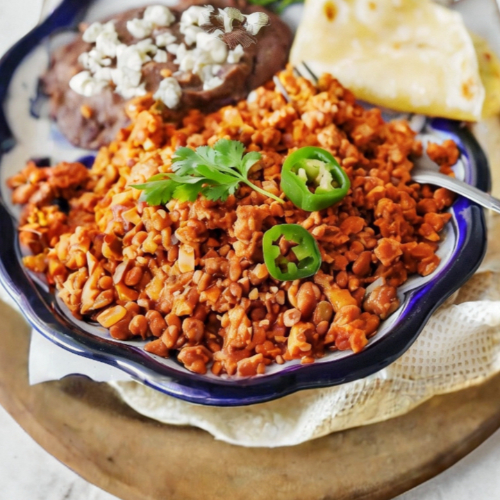 Tortilla de harina, frijol y picadillo