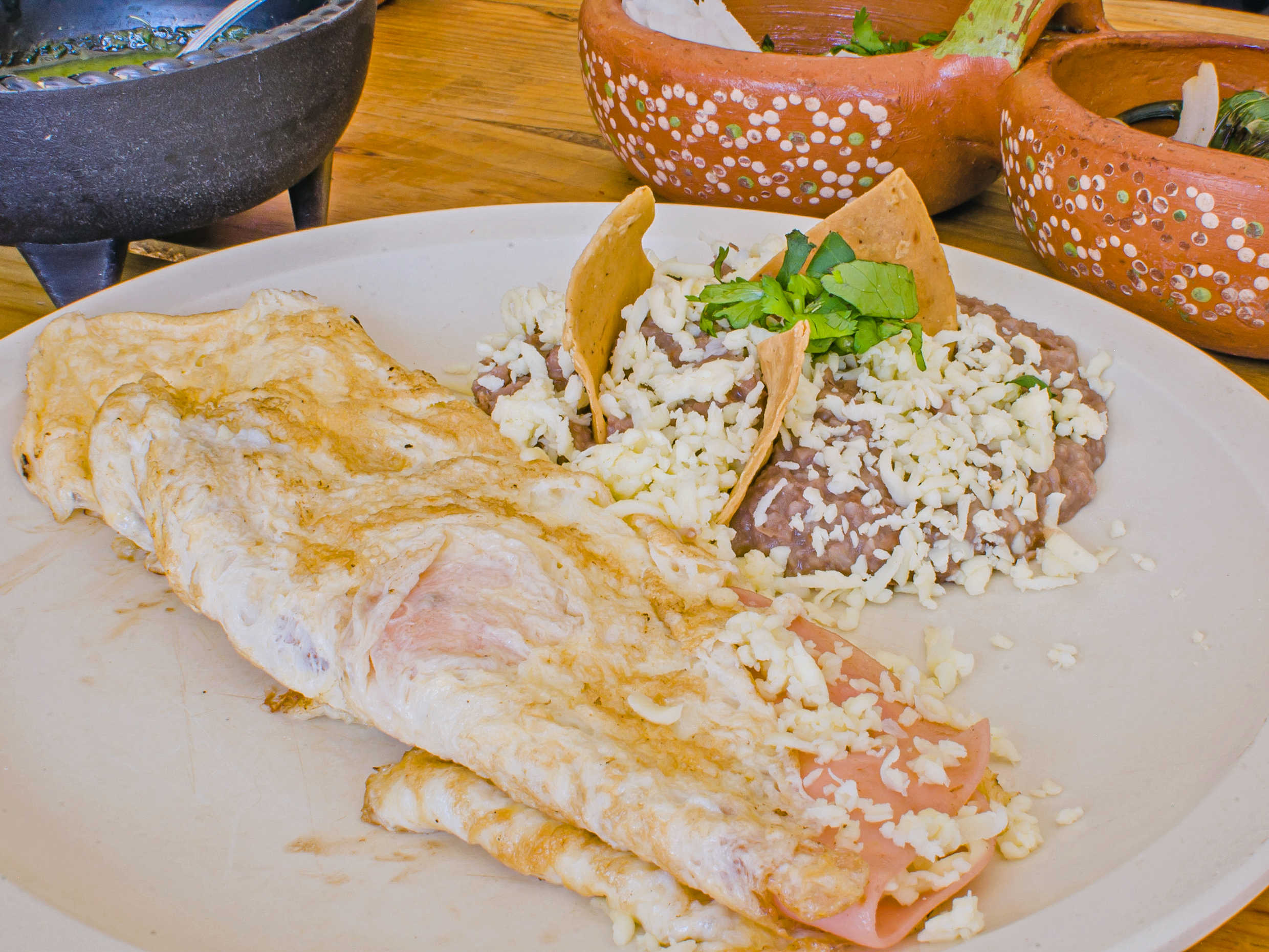 Huevo,jamon y queso envuelto. Acompañado de frijol,tortilla o bolillo