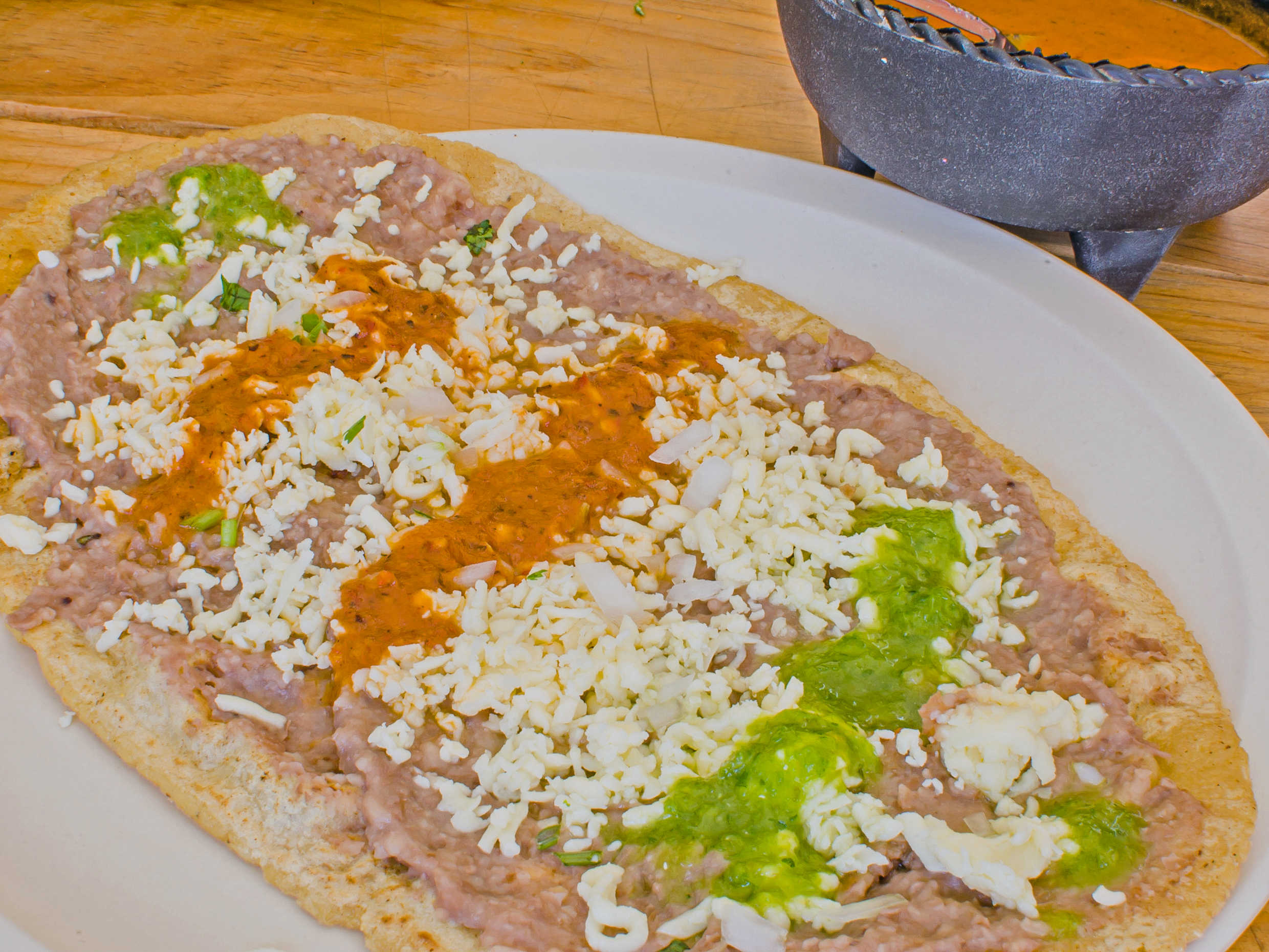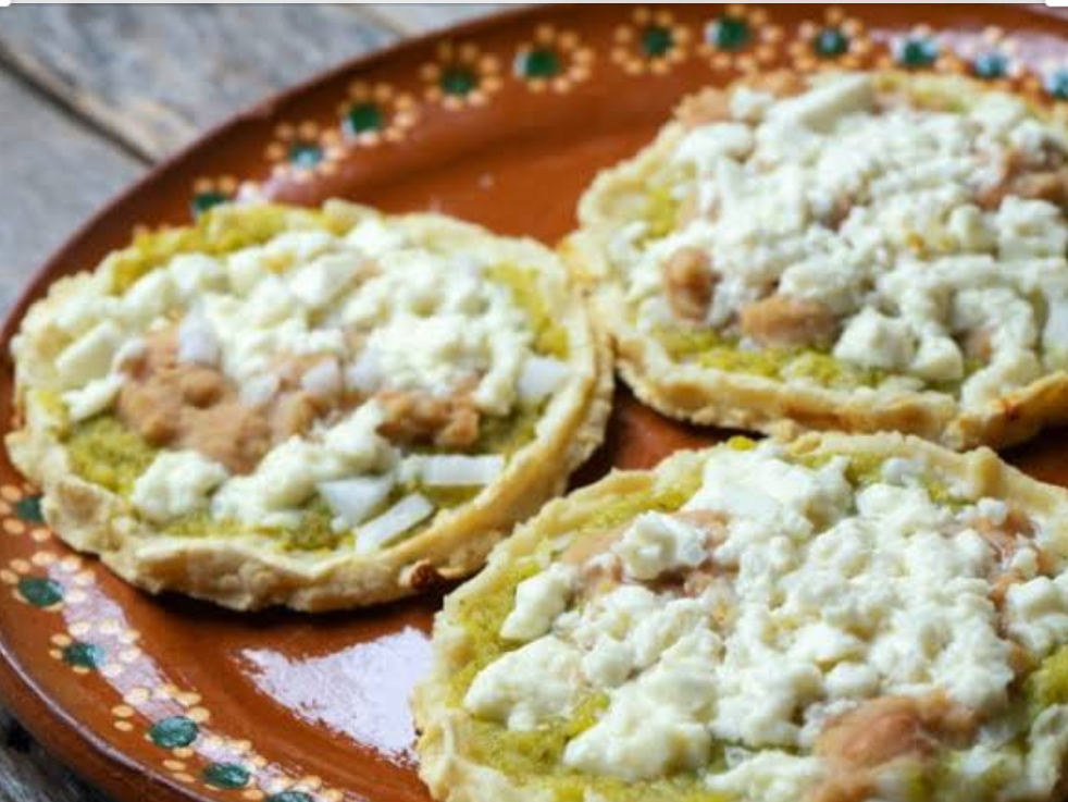 Se prelara con queso , frijoles , cebolla y crema.