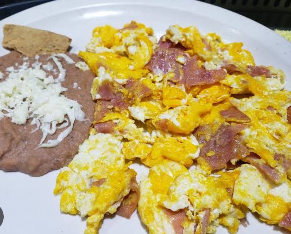 Huevo revuelto con jamón Acompañado de frijol,bolillo o tortilla