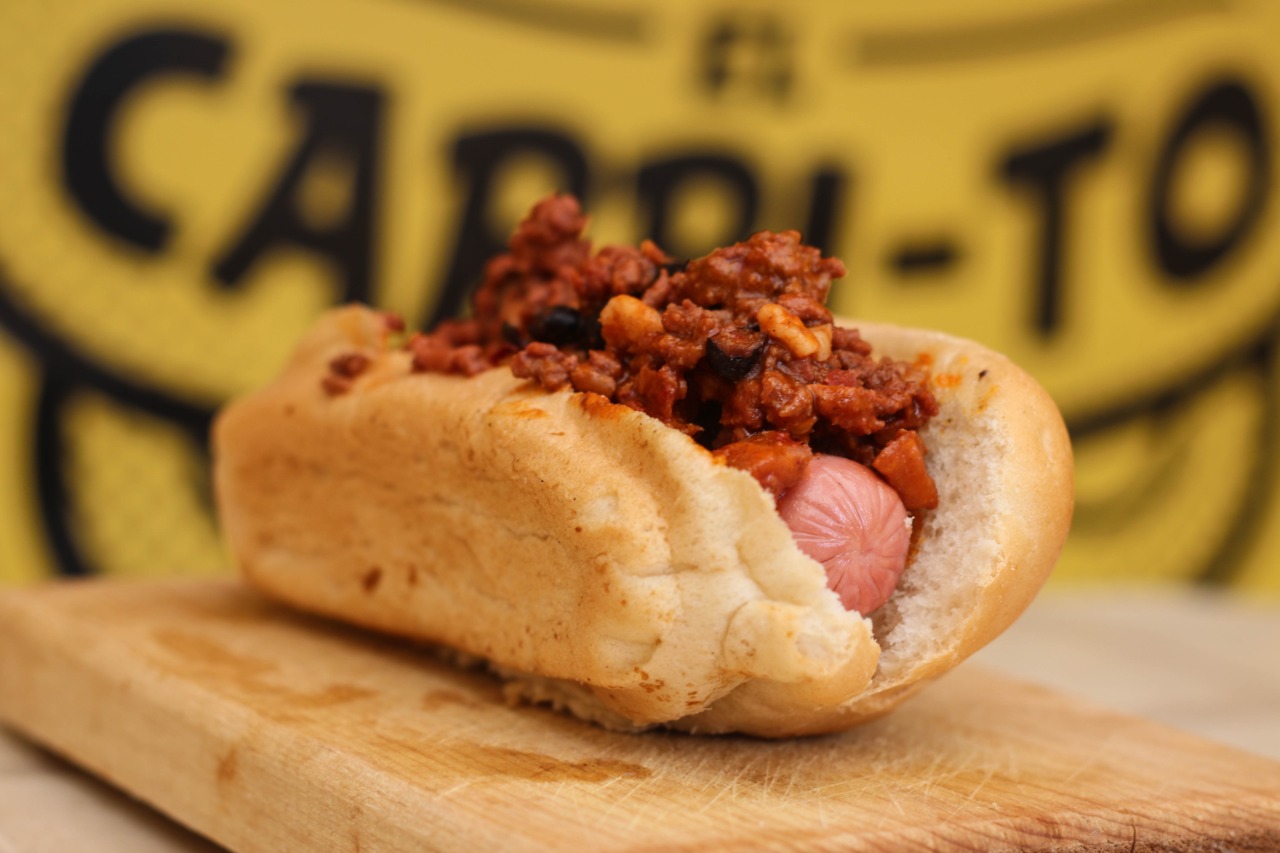 Pan suave, salchicha de pavo y chili (carne molida, frijoles negros, tocino, chorizo y especias), incluye vegetales y aderezos aparte.
