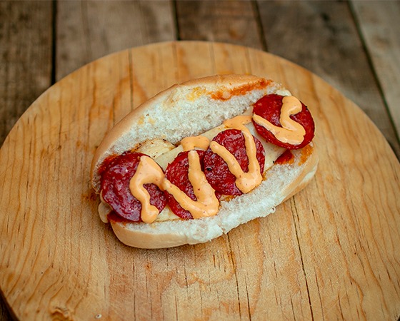 Pan suave, salchicha de pavo, queso cheddar y tocino, incluye vegetales y aderezos aparte.