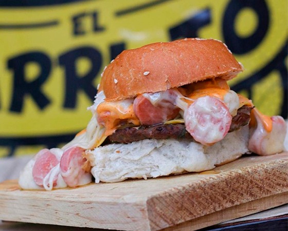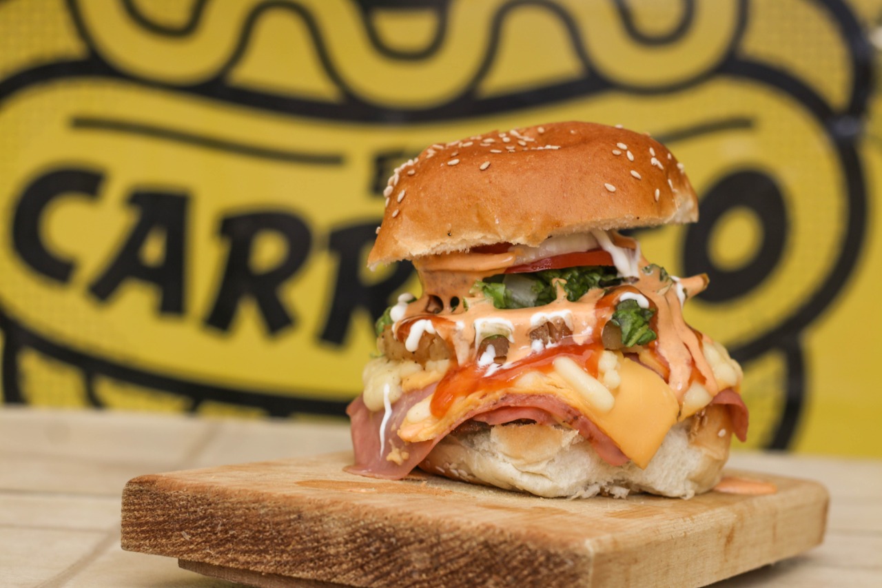 Pan suave, carne de res, aros de cebolla, tocino, bbq y queso amarillo, acompañado de vegetales y aderezos aparte.