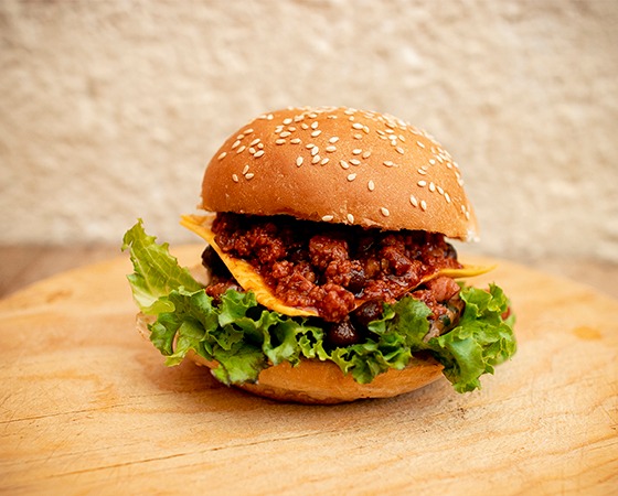 Pan suave, carne de res, queso amarillo y chili(carne molida, frijoles negros, chorizo, tocino y especias), acompañado de vegetales y aderezos aparte.