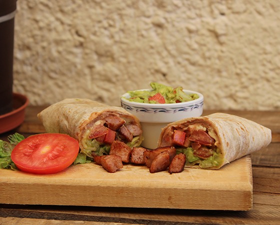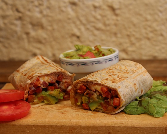 Chorizo, frijoles bayos, queso asadero, guacamole y cebolla asada envueltos en una deliciosa tortilla de harina artesanal.
