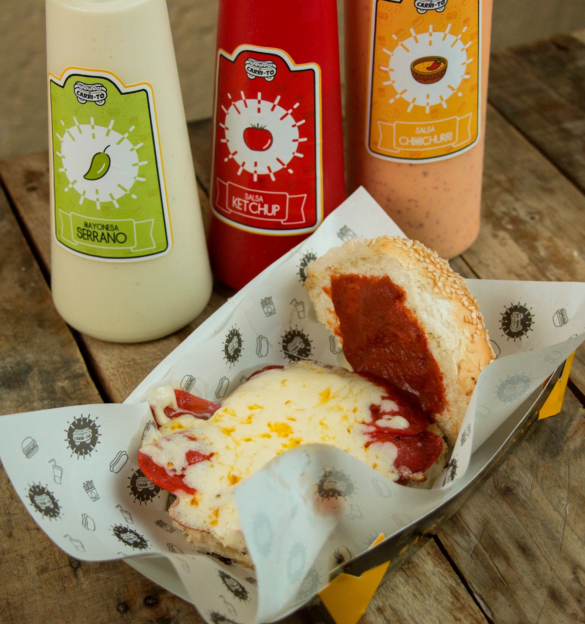 Pan suave, carne de res, pepperoni, queso blanco y salsa de pizza, acompañado de vegetales y aderezos aparte.