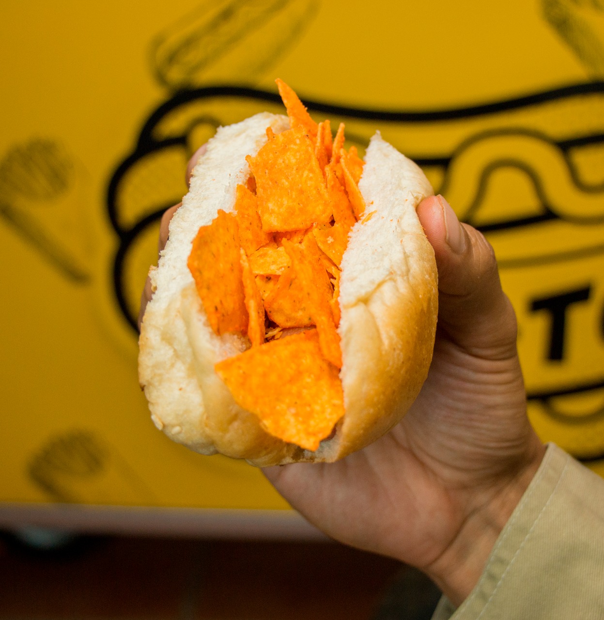 Pan suave, salchicha de pavo y doritos, incluye vegetales y aderezos aparte.