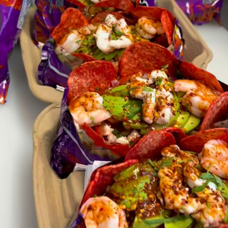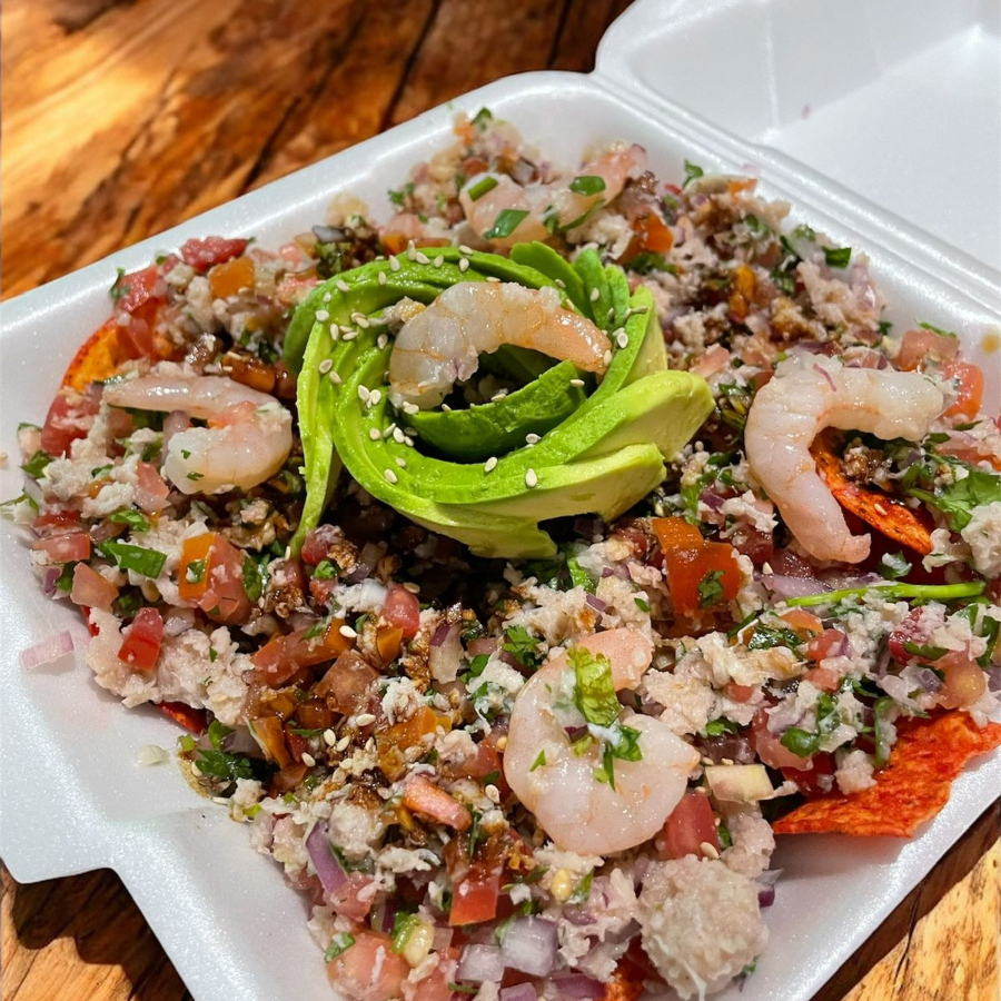 Camaron, ceviche, Jitomate, Cebolla, Aguacate, Limon, Cilantro, Salsas y Ajonjoli
