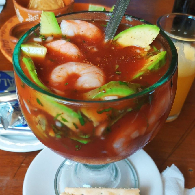 camaron, salsa de tomate, Salsa clasica, Limon, Aguacate, Jitomate, Cebolla Morada, Cilantro y Ajonjoli