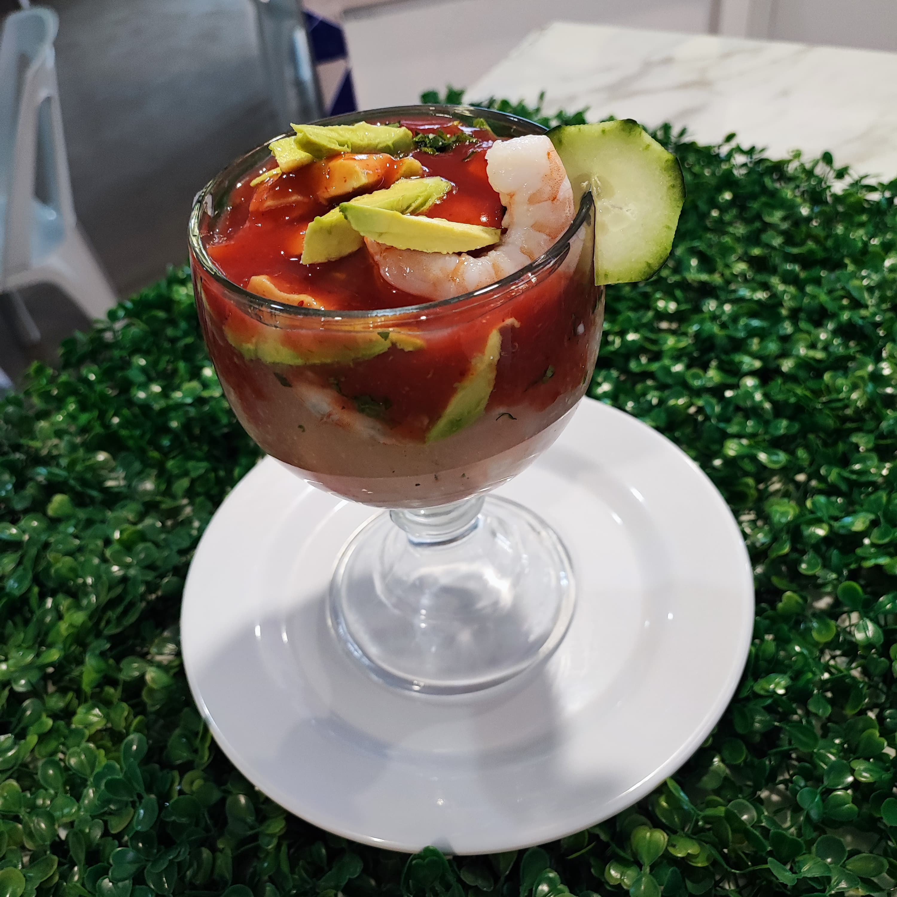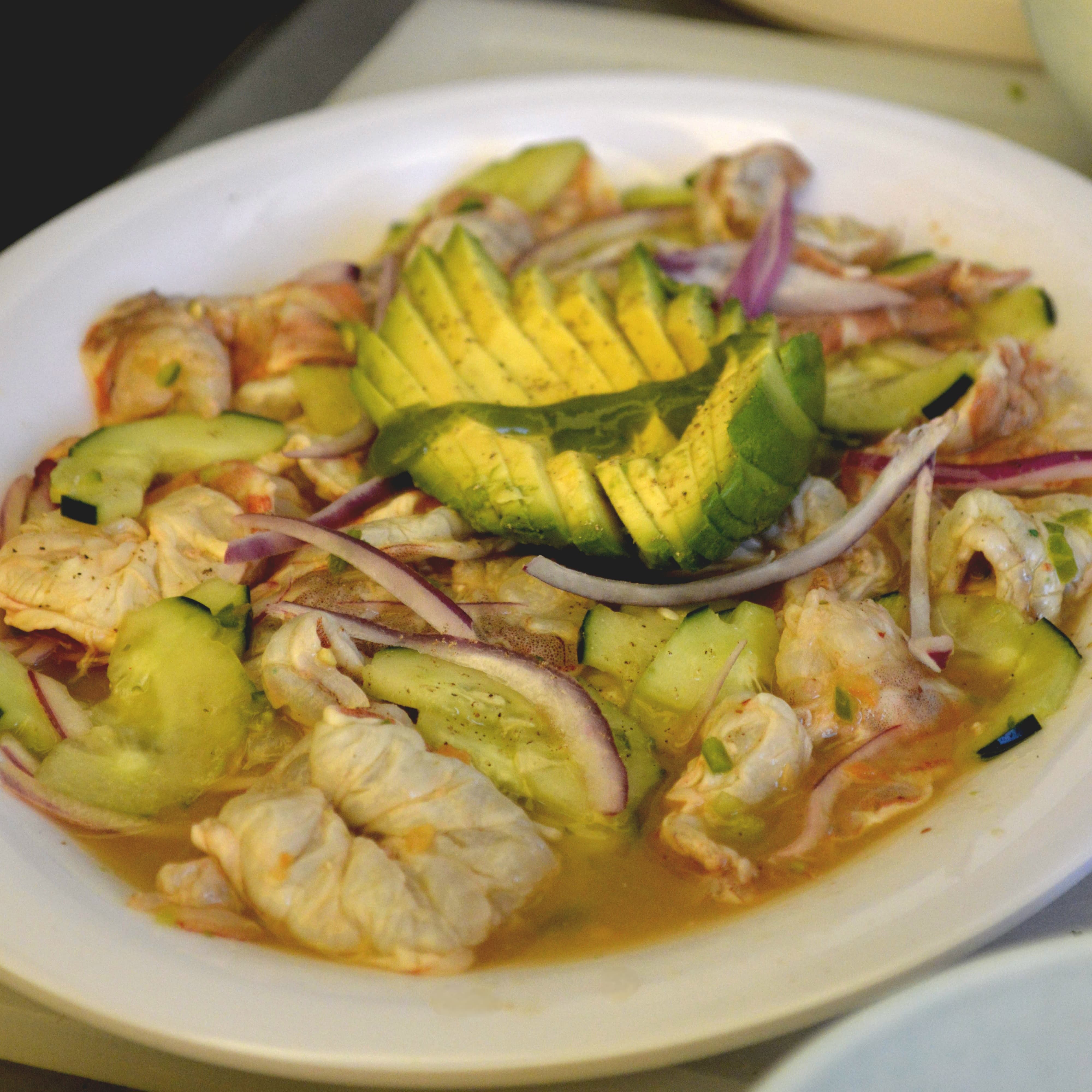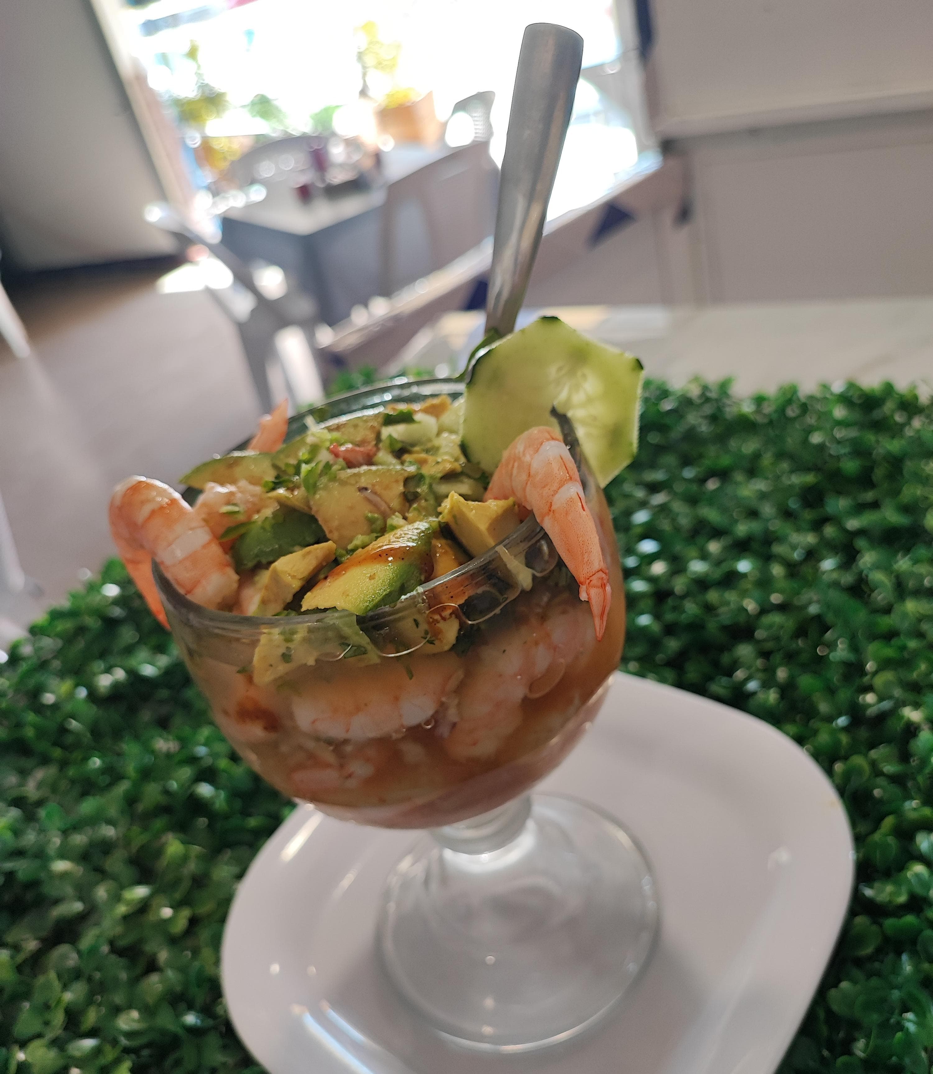 Camarón cocido con limón, cebolla morada, serrano, pepino, habanero y aguacate.