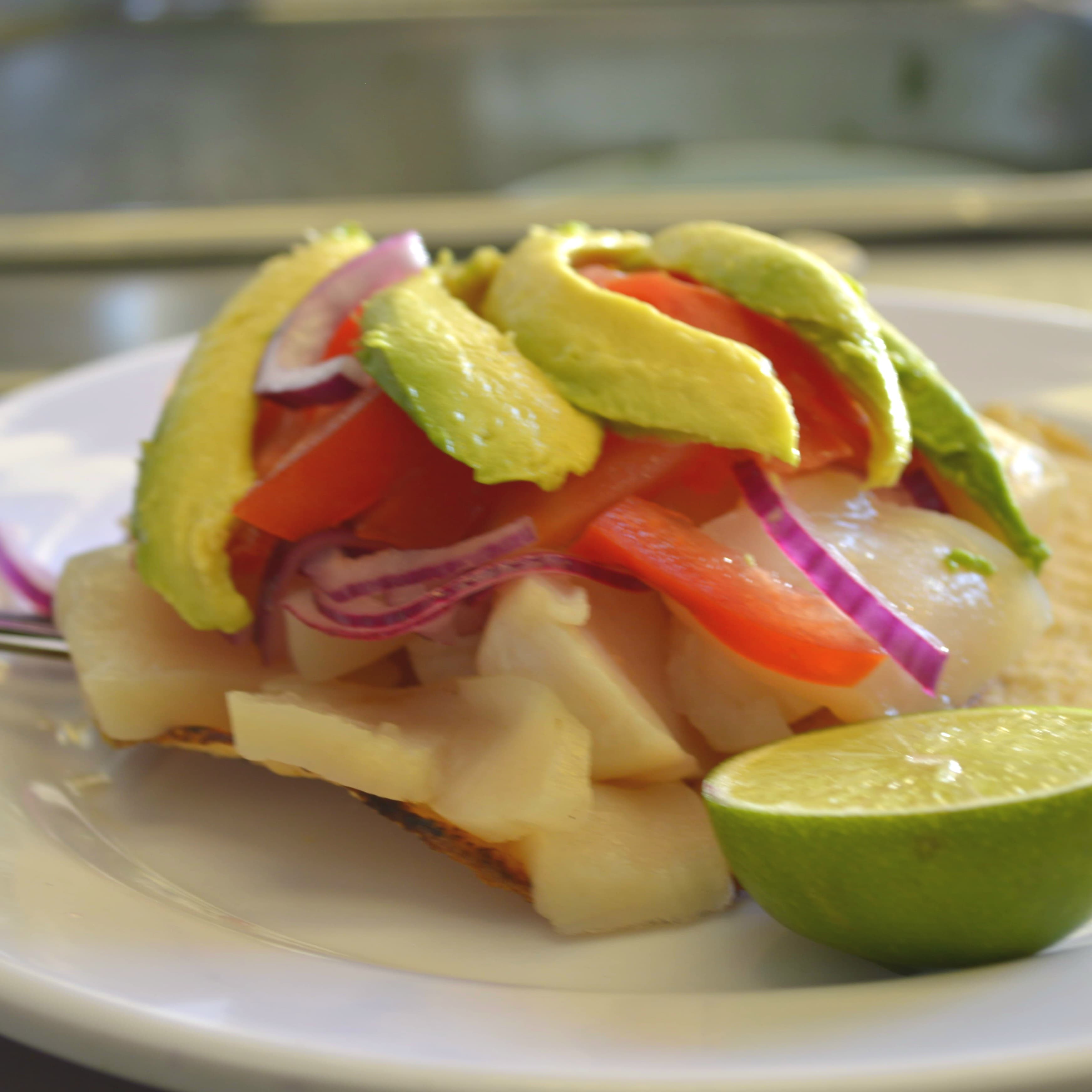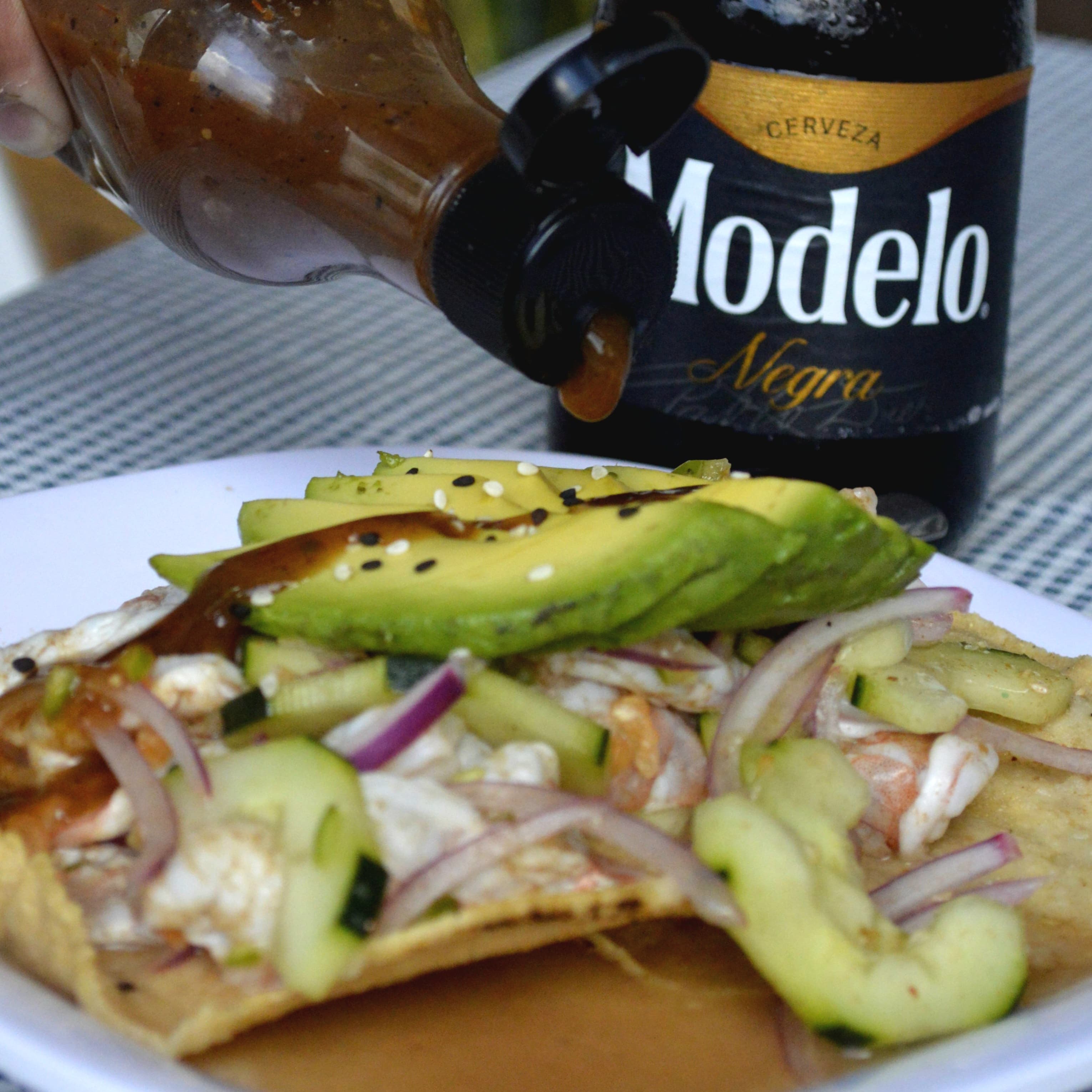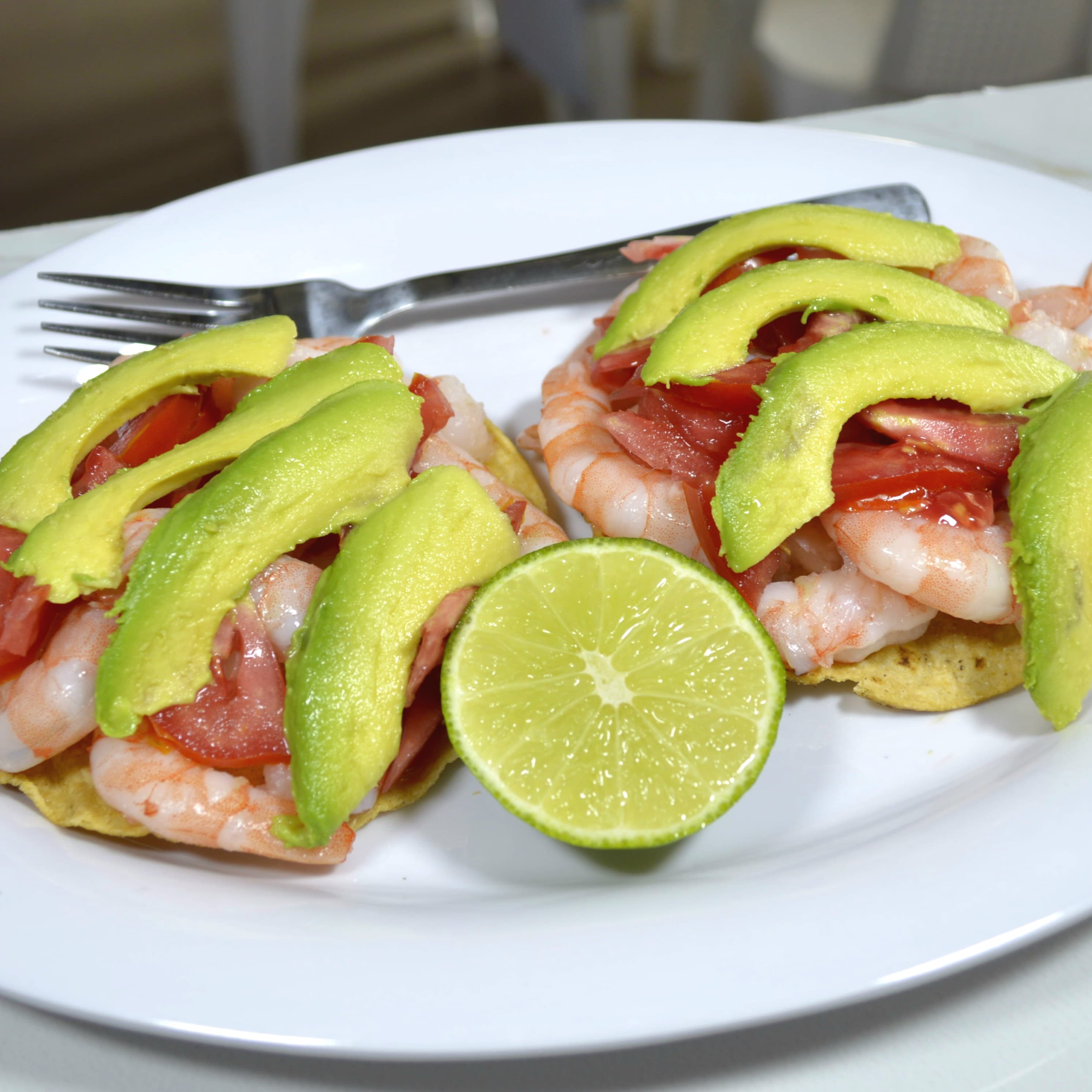Camarón cocido con limón, cebolla morada, serrano, pepino, habanero y aguacate.