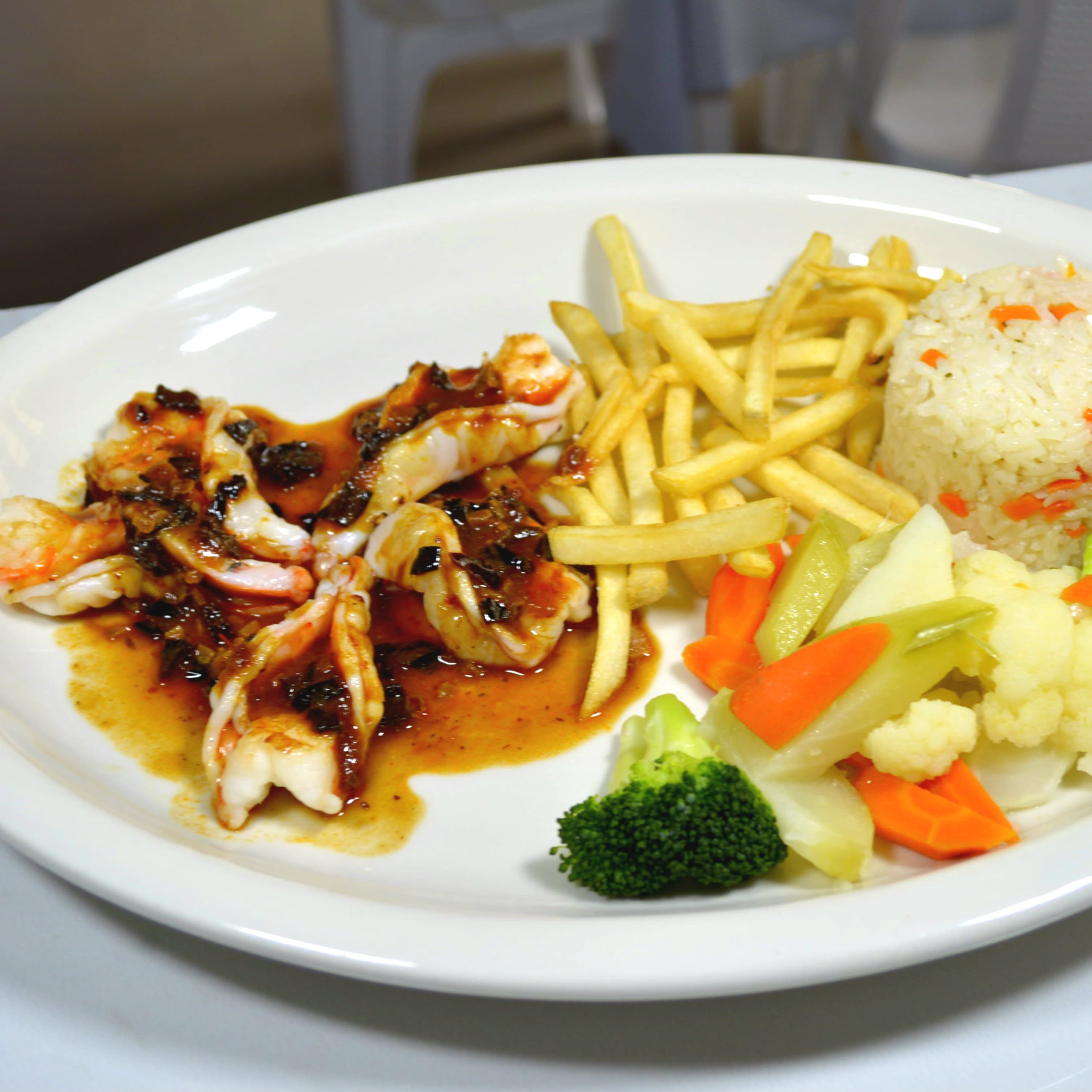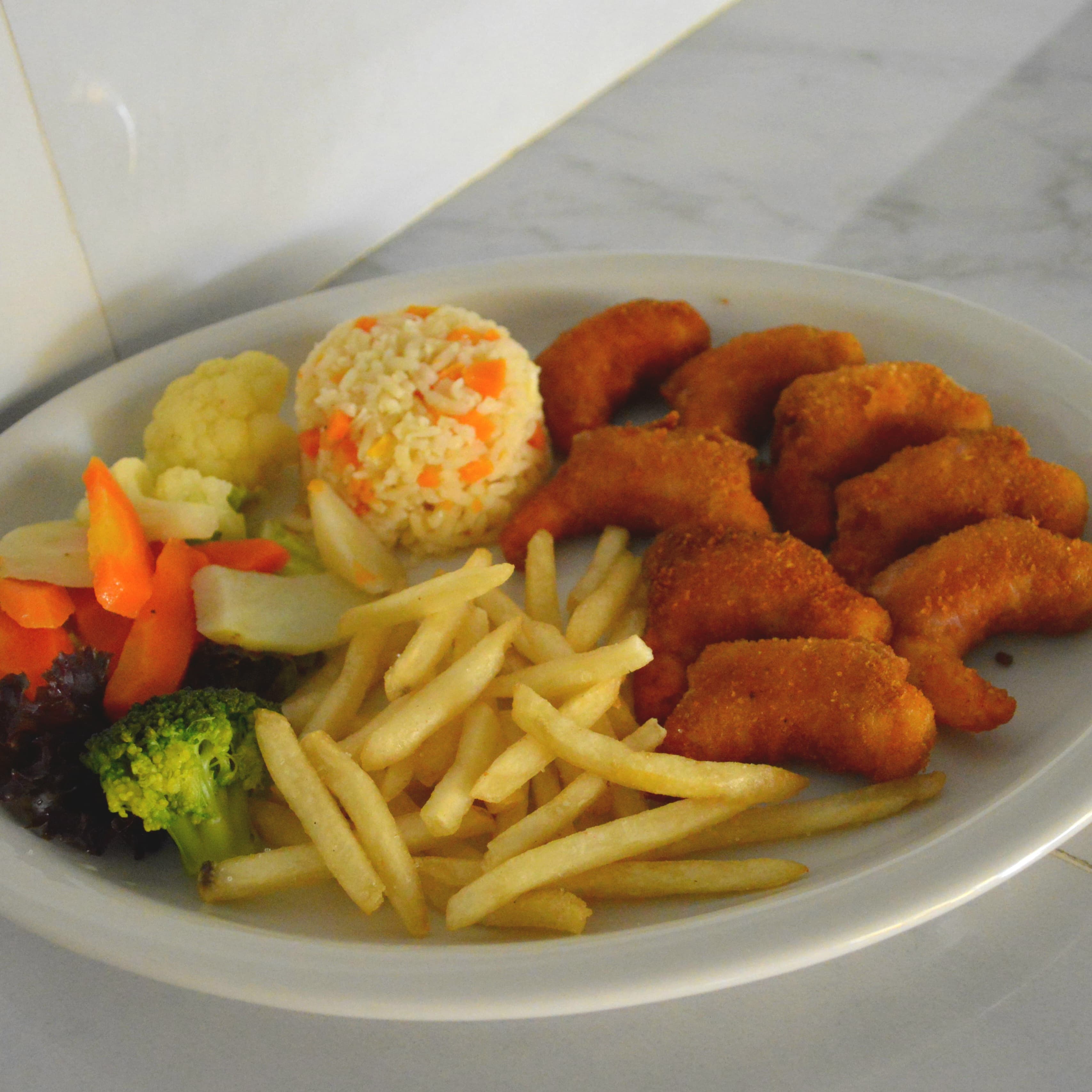 Camarones empanizados, lechuga, queso amarillo, jitomate y cebolla. Acompañada de papas a la francesa.