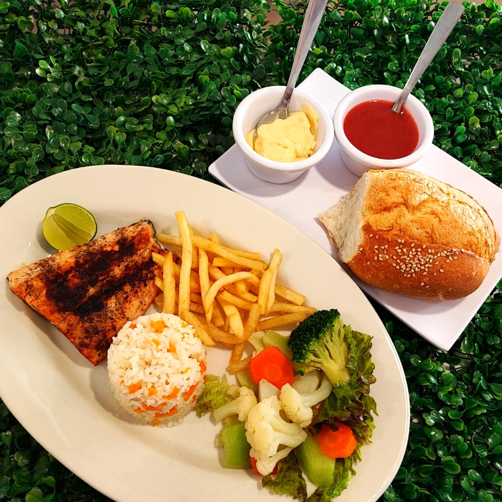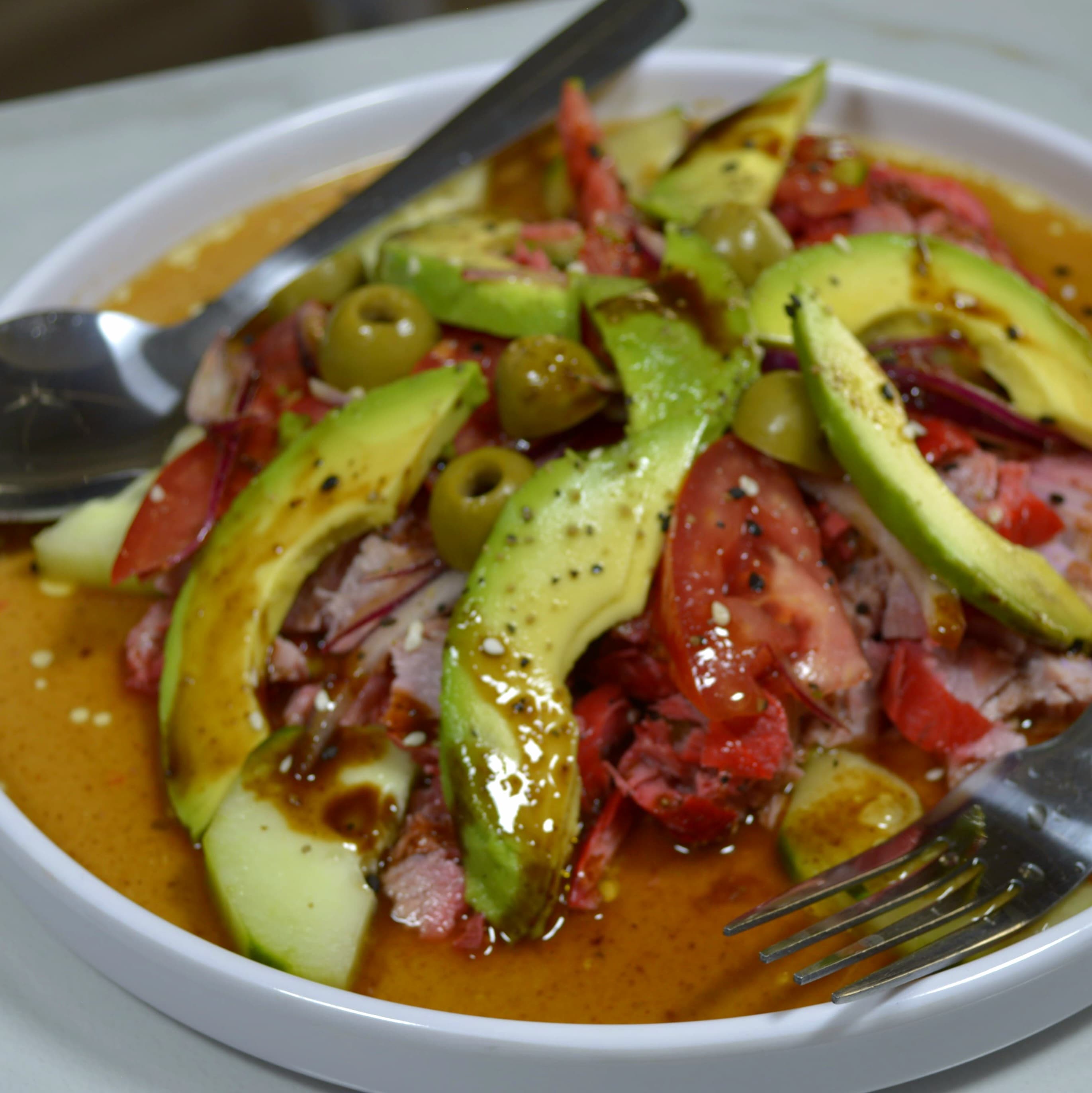 Marlín acompañado de cebolla, jitomate, pepino, vinagreta y aceitunas.