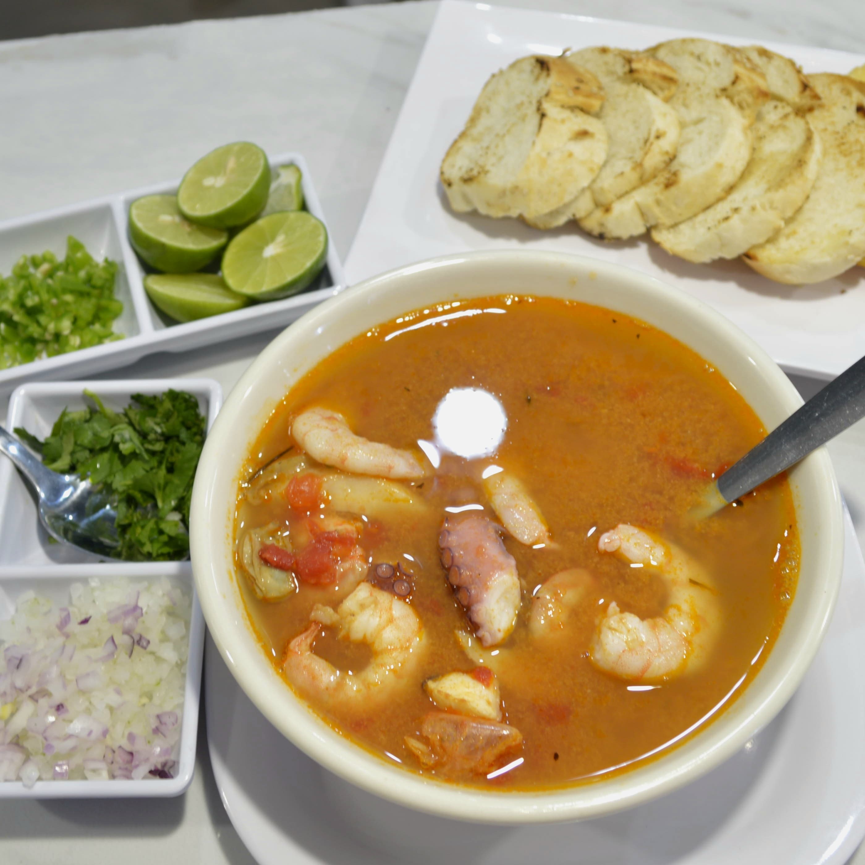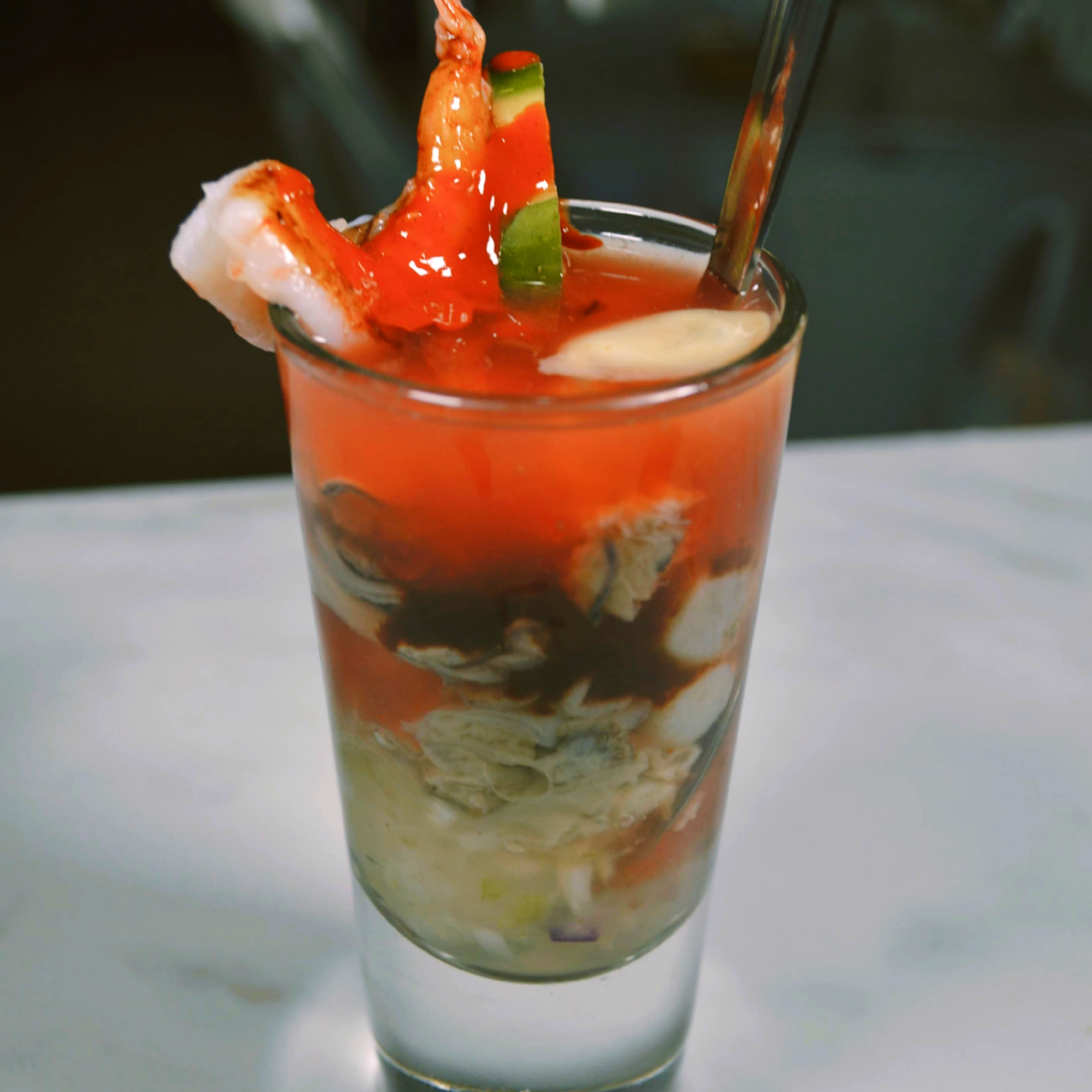 Camarón, pulpo, callo, caracol, ostión (coctel con pepino, cebolla, cilantro, serrano y aguacate sazonada con salsas verdes).
