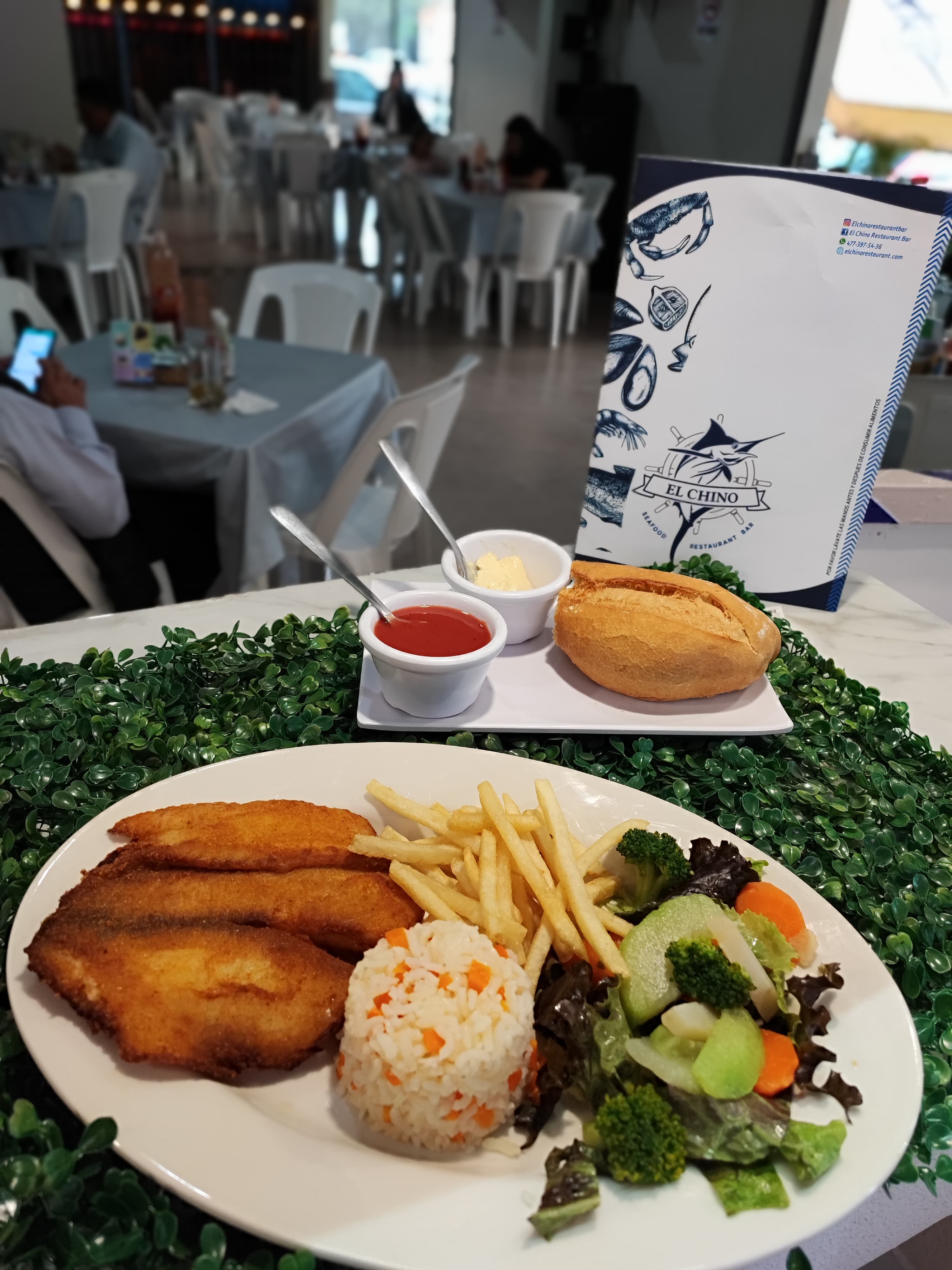 Filete empanizado, mayonesa, lechuga, cebolla morada, jitomate y aguacate.