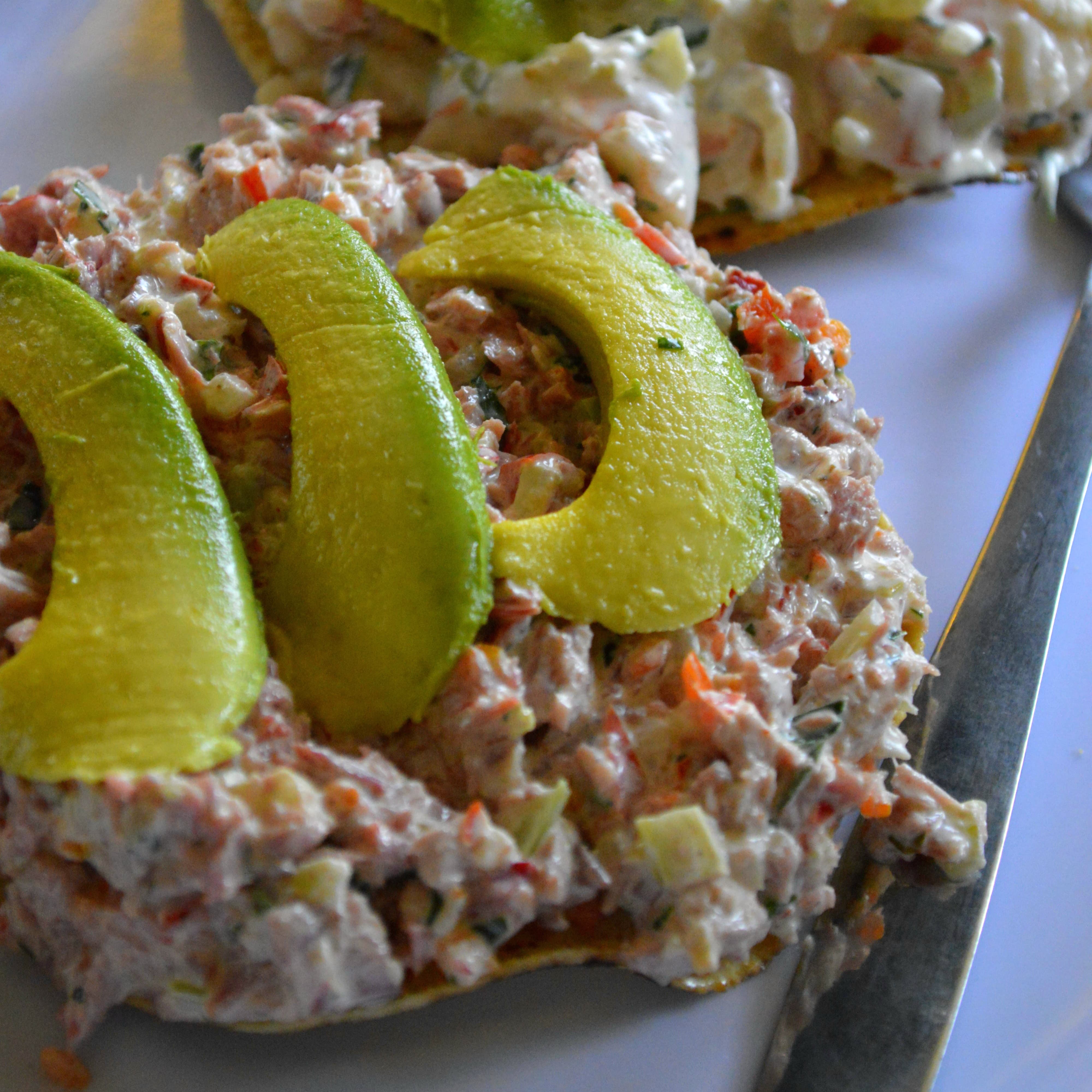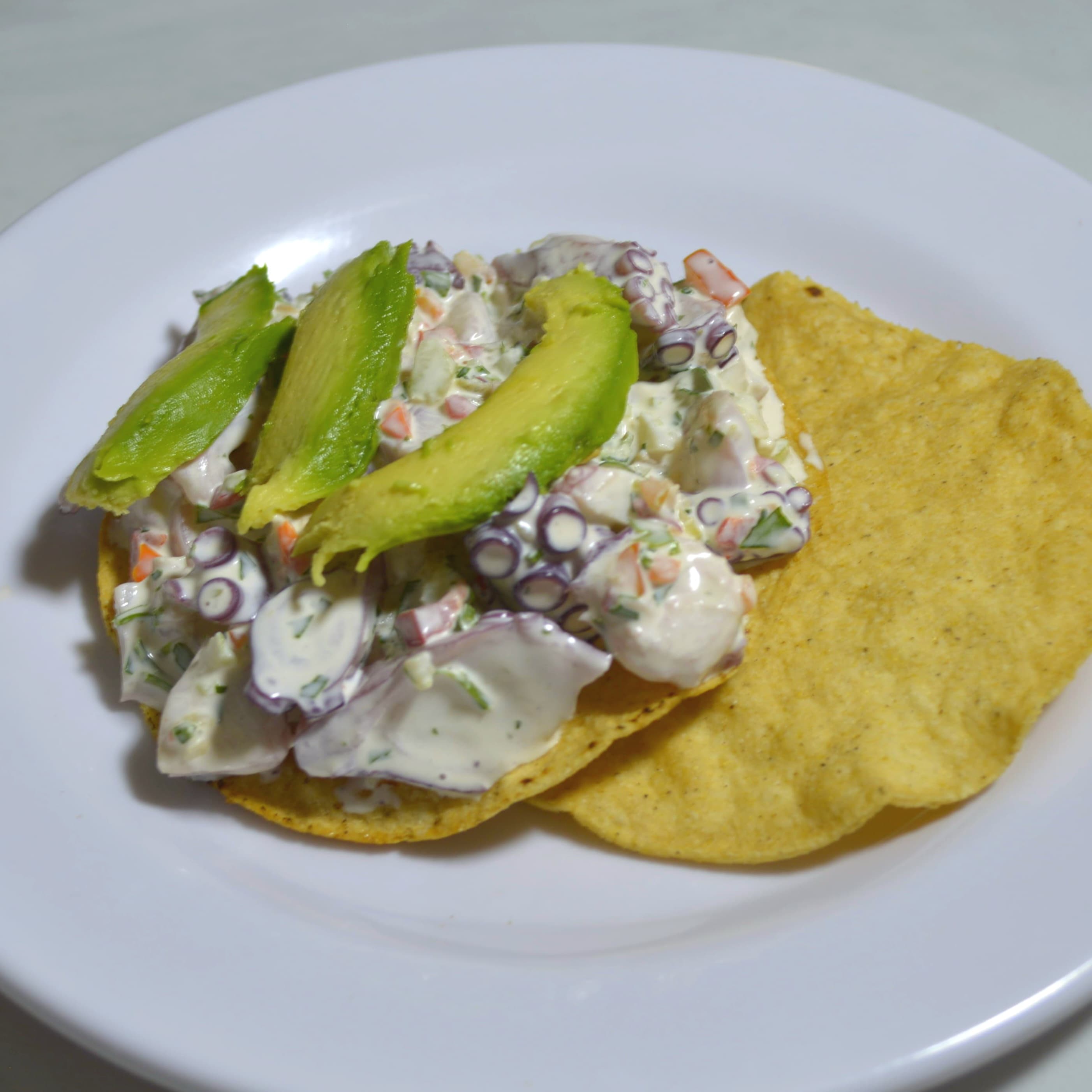 Pulpo picado mezclado con cebolla y morrón con mayonesa.