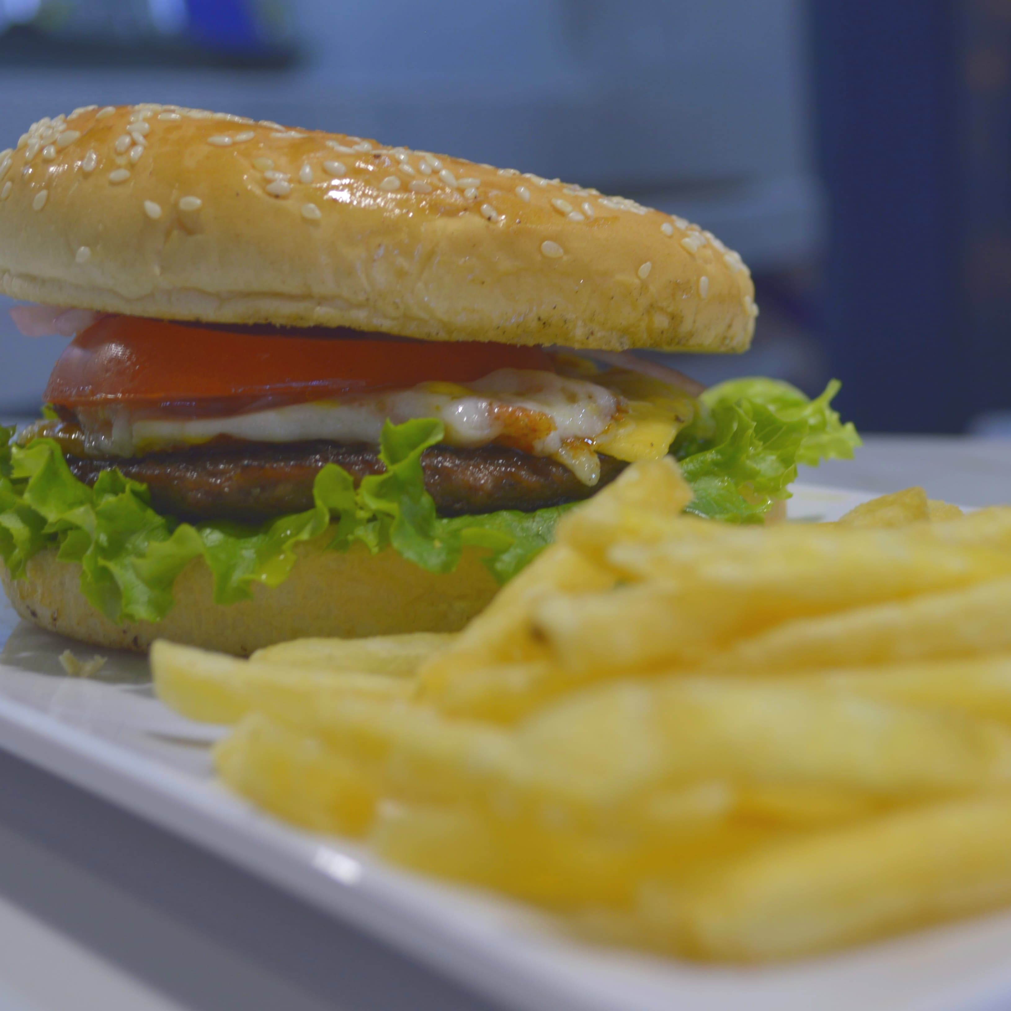 Carne de res, queso amarillo, lechuga, cebolla y jitomate acompañada de papas a la francesa.