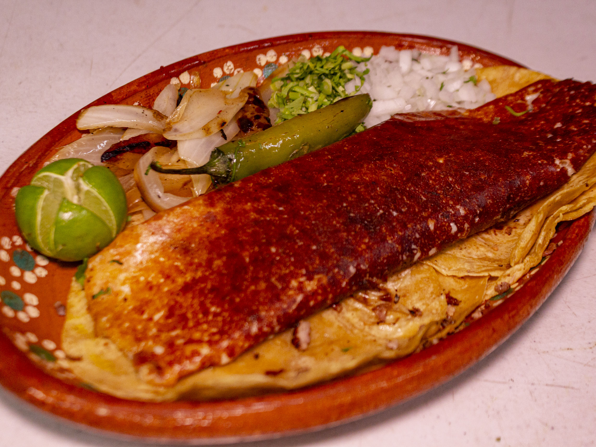 Chile Hungaro (chile güero largo) Asado Sobre Dos Tortillas De Maíz, Relleno De Queso Gratinado Y Carne De Su Elección.